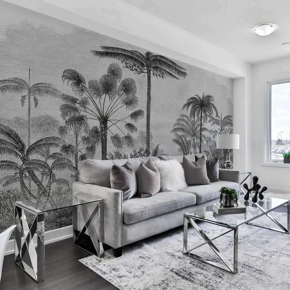 Adding the Wall mural featuring lush plants, expansive nature, and a serene sky transforms your living room into a vibrant tropical escape. The mural's depiction of palmetto and tropical trees evokes a sense of calm and relaxation, creating an inviting atmosphere. Natural greens enhance the room's brightness, while the soothing blue of the sky provides a perfect backdrop, making the space feel airy and open. This refreshing environment encourages tranquility and connection to nature, inviting you to unwind and enjoy every moment spent in the space.