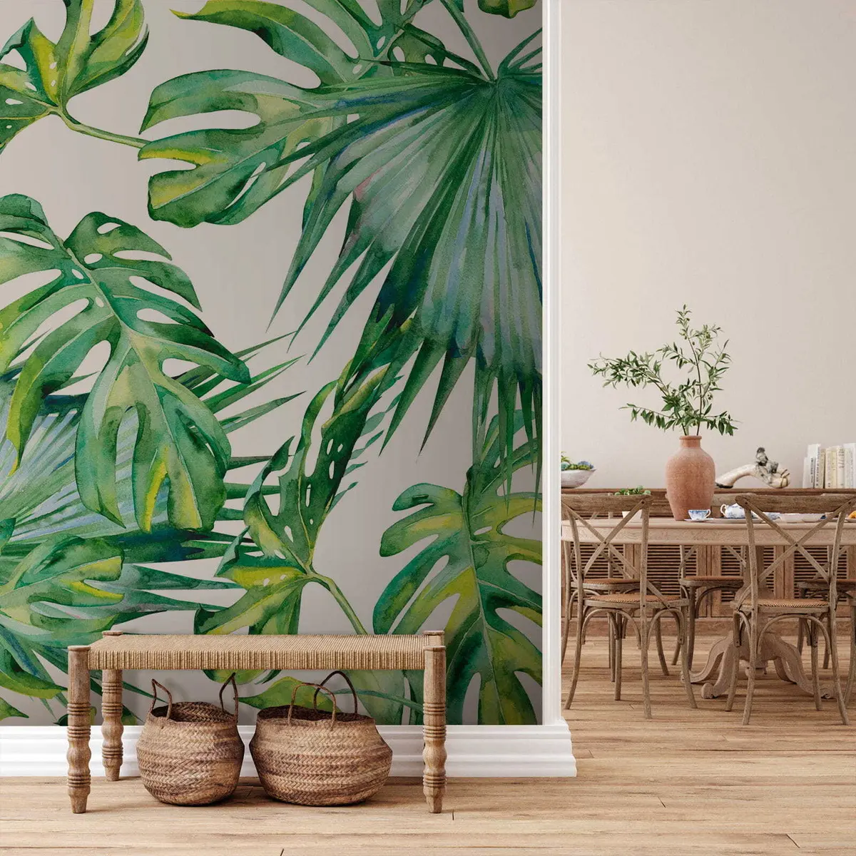 Transforming your living room with Wall Murals Juicy Palm Leaves Nr. u53522 introduces a vibrant, refreshing atmosphere. The lush monstera and palm leaves create an inviting jungle feel, infusing the space with life and energy. This design not only enhances visual interest but also promotes a sense of tranquility, making it an ideal setting for relaxation. The interplay of green tones brightens the room, fostering harmony and a connection to nature, while the bold patterns serve as stunning focal points, elevating the overall aesthetic beautifully.