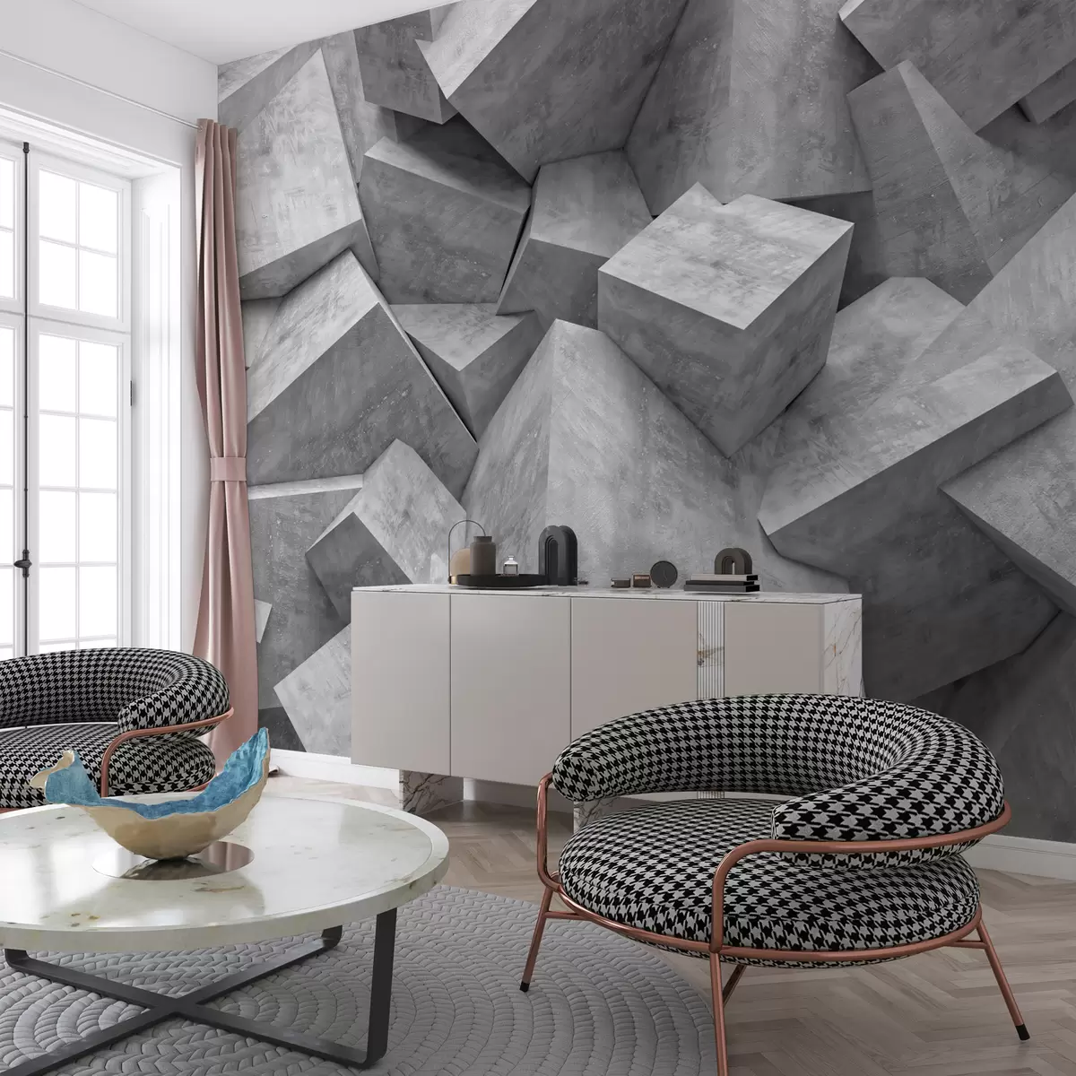 The installation of the Wall mural Wood, grey and rectangle Nr. u56307 transforms the living room into a modern and stylish space. The 3D geometric shapes create a dynamic visual effect, enhancing the room's depth and character. The concrete-inspired design adds an industrial touch, while the grey tones maintain a sophisticated and neutral palette that complements various decor styles. This change not only invigorates the interior but also promotes a calming and contemporary atmosphere, perfect for relaxation or social gatherings.