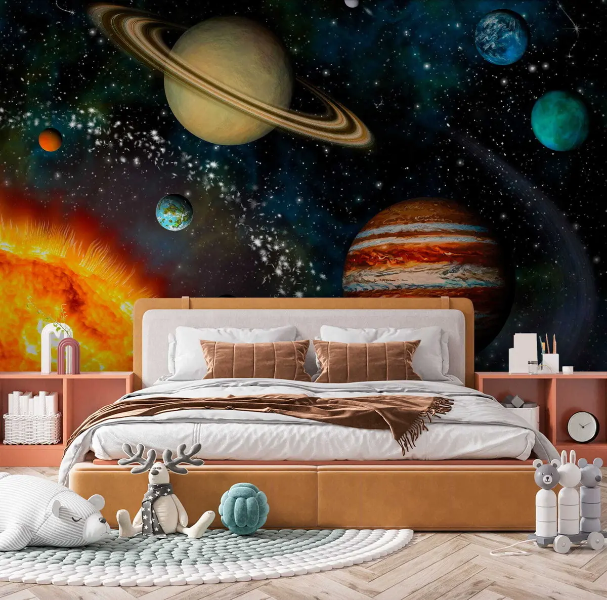 Transforming your living room with the Wall mural Solar system Nr. u57683 brings a captivating cosmic theme that inspires wonder and curiosity. The vivid colors and dynamic imagery of planets and stars create a sense of depth, making the space feel larger and more inviting. This mural not only serves as a stunning focal point but also sparks conversations and imaginative journeys into the universe. It enhances the overall ambiance, creating a relaxing and stimulating environment for both family and guests. Perfectly complements modern and playful decor.
