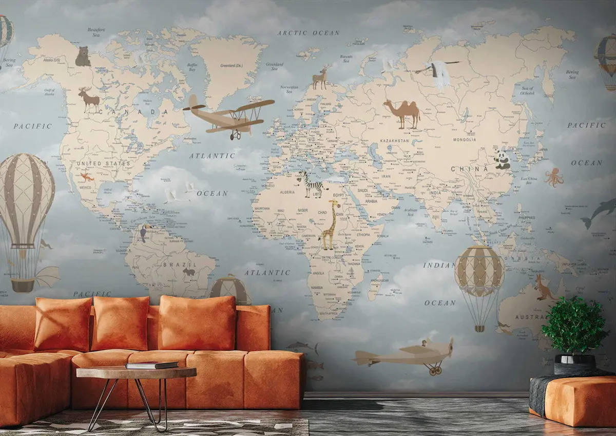 The Wall Murals World map beautifully enhances the living room, creating a vibrant and educational space. The playful design, featuring hot air balloons and wild animals, invites curiosity and exploration. This mural serves as a stunning focal point, transforming the atmosphere into one that inspires adventure and learning in a child's environment. Ideal for a boy's room, it encourages imaginative play while also being a practical educational tool for understanding geography and world cultures. The colors and illustrations add warmth and charm, making the room feel more inviting.