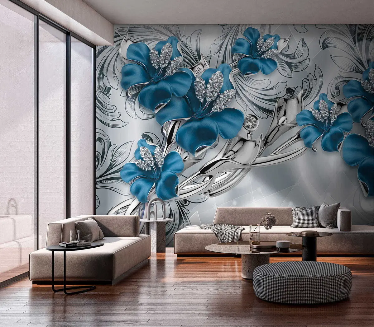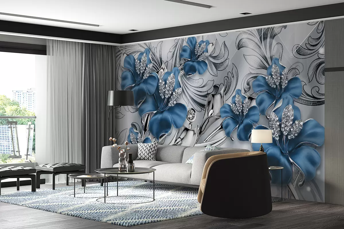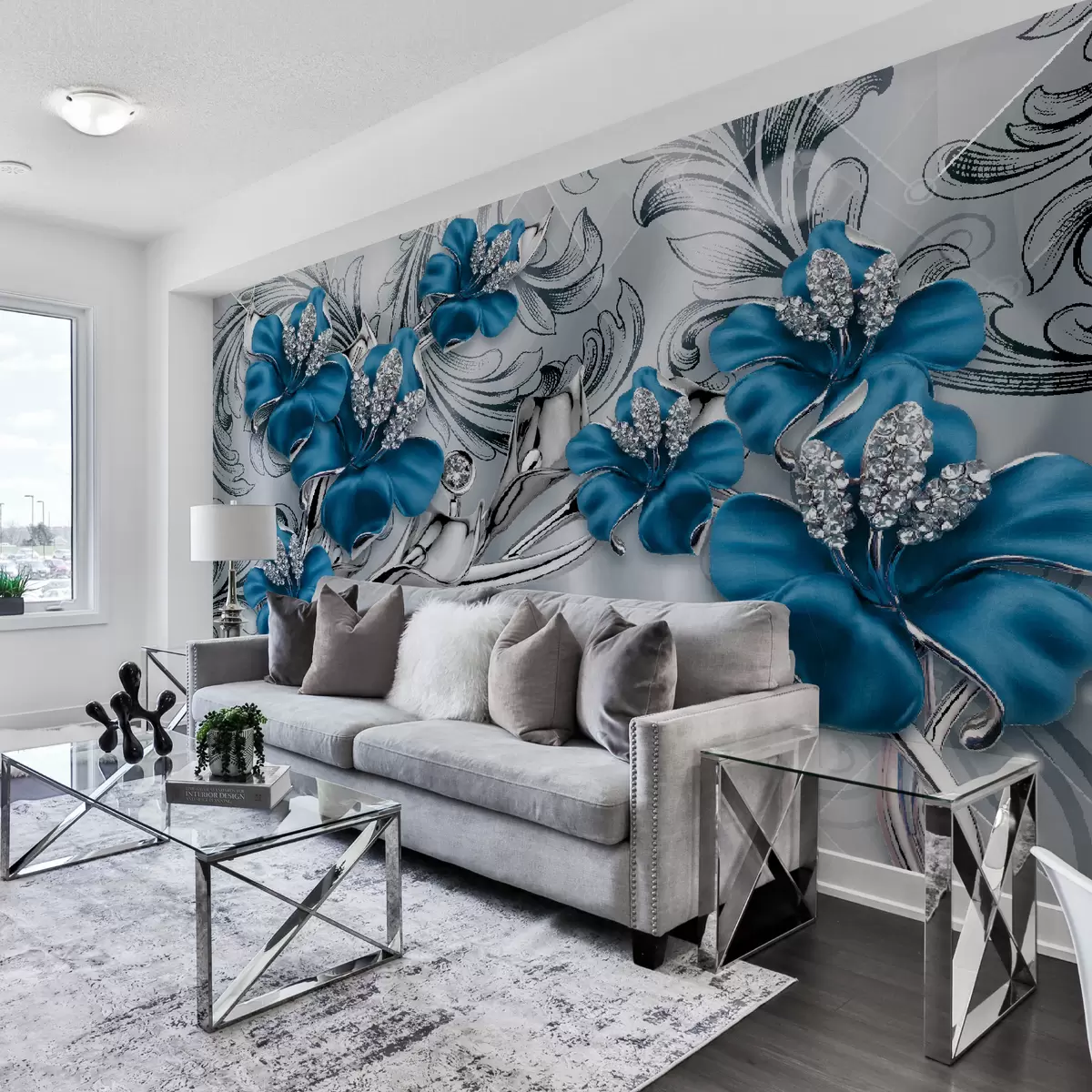 Transforming your living room with the Wall Mural Azure Flowers on Silver U60405 creates a serene and stylish atmosphere. The harmonious blend of vibrant azure flowers against a textured backdrop adds a touch of elegance and depth. This 3D design brings the wall to life, enhancing the overall aesthetic and making the space feel more inviting. The floral elements evoke a sense of tranquility, perfect for relaxation or entertaining guests. The mural works beautifully with various color schemes, making it a versatile choice for any decor style.