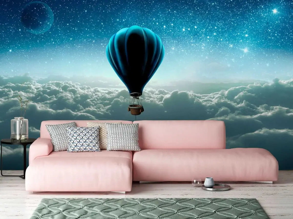 Transforming your living room with the hot air balloon mural set against the night sky brings a serene and dreamlike quality to the space. The mural invites a sense of wonder, making the room feel more expansive and open, with its stunning depiction of clouds and twinkling stars. The soothing colors create a peaceful atmosphere perfect for relaxation. This artistic backdrop not only enhances the aesthetic appeal but also sparks conversations and inspires daydreams, adding a touch of magic to your everyday environment.