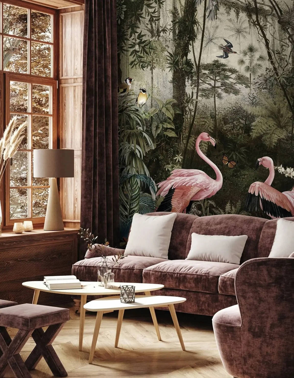 The interior of the living room transforms into a vibrant paradise with the wall mural featuring tropical birds and flamingos. The artwork creates a lively focal point, infusing the space with a sense of adventure and tranquility. The lush greenery and playful flamingos invite a tropical ambiance, making the room feel more expansive and alive. This serene backdrop enhances the overall decor, inspiring relaxation and joy while effortlessly connecting nature to daily living. The rich colors add depth and warmth, making it an inviting haven.