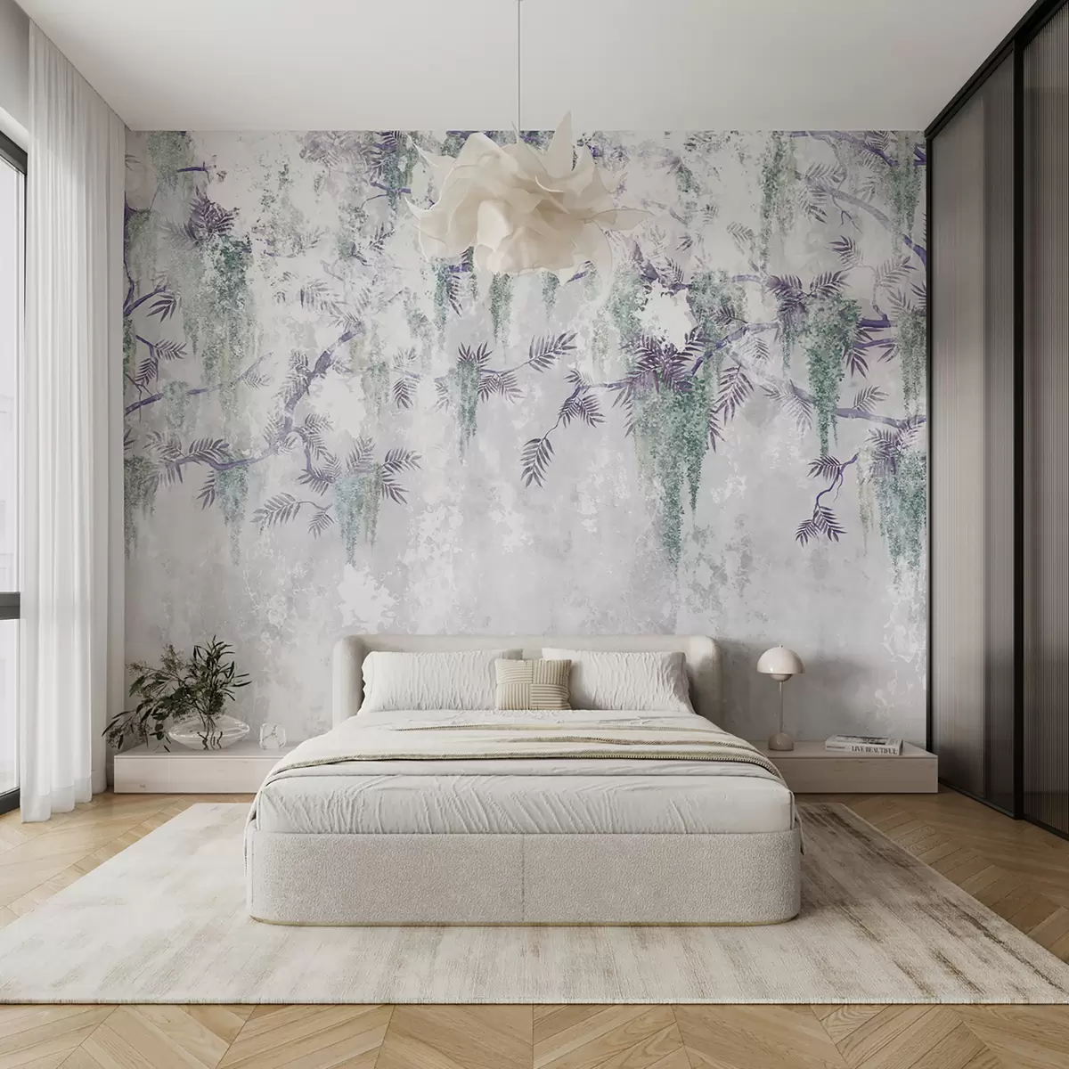 The addition of the trendy grunge wall mural featuring delicate wisteria branches with purple flowers and soft blue hues transforms the living room into a serene oasis. The botanical art creates an inviting atmosphere, blending nature with modern design. The gentle colors harmonize beautifully, enhancing the space’s elegance and providing a calming backdrop for relaxation or entertaining. This mural adds depth and character, making the room feel more expansive and vibrant, perfect for any decor style.