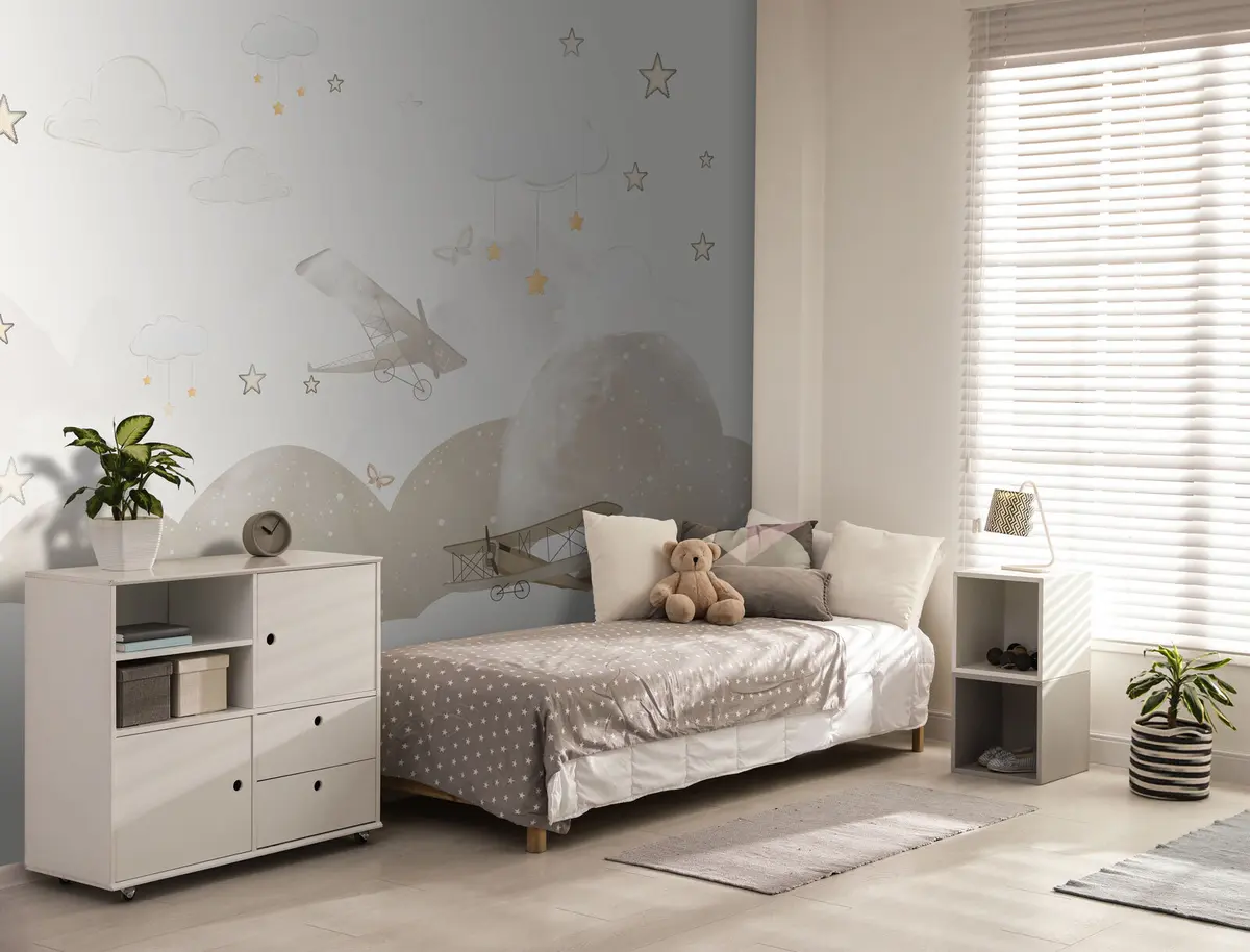 The addition of Wall Murals in Scandinavian Speech Style and Star Sky transforms the living room into a whimsical haven. The soft, pastel hues create a calming atmosphere, perfect for relaxation and creativity. Delicate airplanes and clouds stimulate imagination, making it an ideal space for kids. This enchanting backdrop complements the playful nature of a boy's room or a newborn's nursery, inspiring dreams of adventure and exploration. The overall effect fosters joy and a sense of wonder, enhancing the room's charm and making it inviting for family and friends.