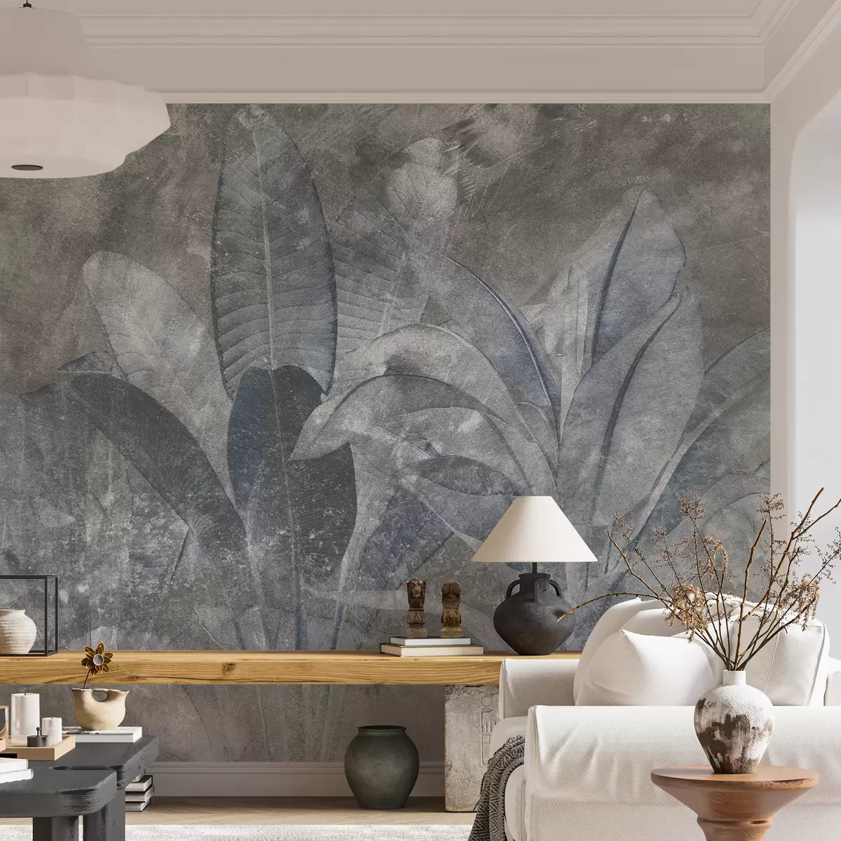 The installation of the banana leaves wall mural on a stone background transforms the living room into a serene oasis. The muted tones of gray and the subtle textures of the concrete evoke a sense of calm and sophistication. The lush foliage pattern adds a touch of nature, creating a refreshing contrast against the sturdy stone backdrop. This combination invites a tranquil ambiance, enhancing the overall aesthetic while making the space feel more expansive and inviting. The composition seamlessly blends modern and natural elements, elevating the decor.