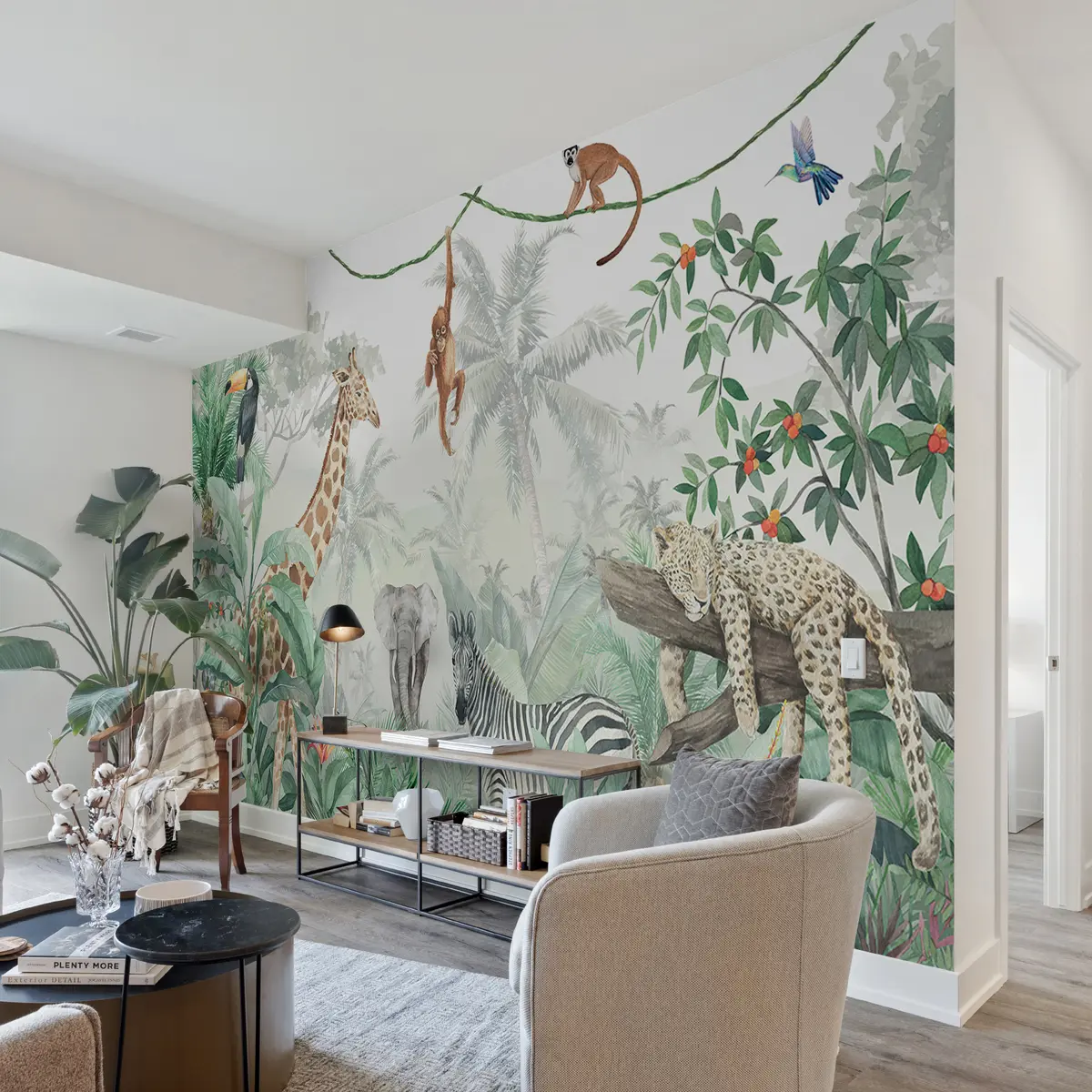 The addition of the Wall Murals Panorama of jungle with animals transforms the living room into a vibrant oasis. The lush greenery and diverse jungle animals infuse the space with life and energy, creating a welcoming atmosphere. The visual depth of the mural draws attention, making the room feel more expansive and adventurous. Guests are enchanted by the safari ambiance, encouraging conversation and sparking imaginations. This stunning design not only enhances aesthetic appeal but also promotes a sense of tranquility and connection with nature.