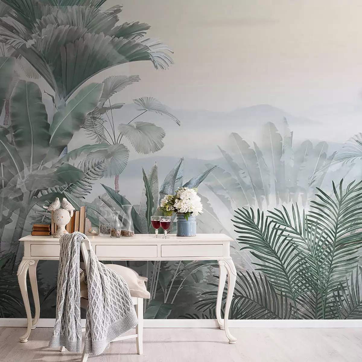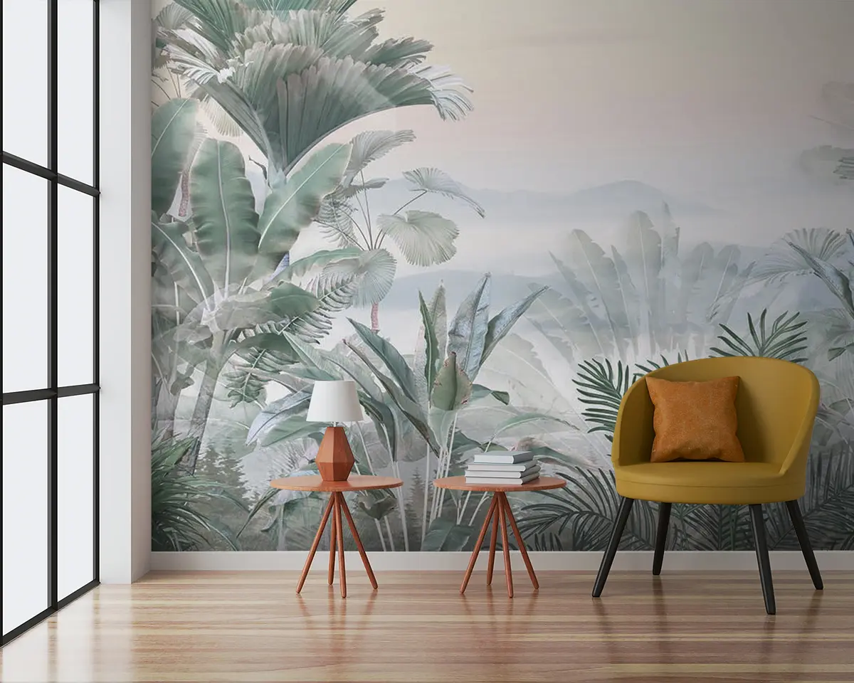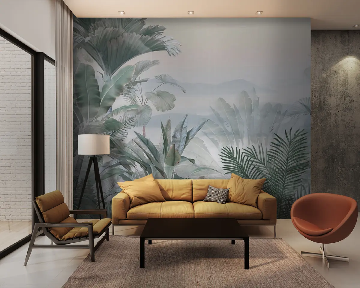 The addition of the Foggy Tropics mural transforms the living room into a serene escape. The subtle hues of tropical greenery create a calming atmosphere, inviting relaxation. Lush jungle scenes with diverse palm leaves provide a refreshing touch that breaks the monotony of conventional walls. This mural not only enhances the aesthetic appeal but also connects the space with nature, making it feel more expansive and vibrant. The overall ambiance is now more inviting, encouraging tranquility and a sense of adventure within the home.