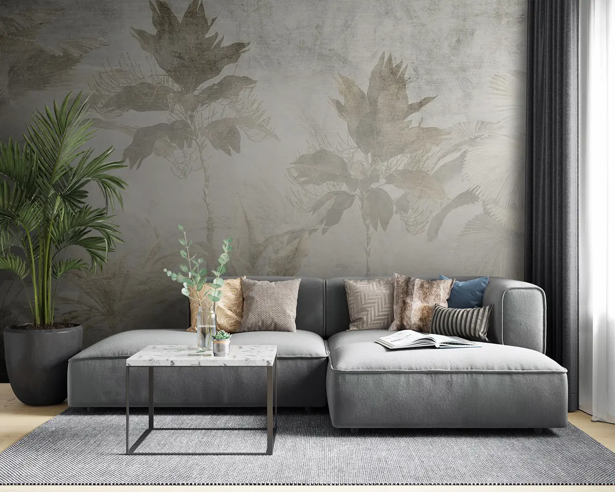 The addition of the brown botanical wall mural instantly transforms the living room into a serene sanctuary. The vintage nature theme pairs beautifully with the beige tones, creating a warm and inviting atmosphere. The tropical trees evoke a sense of tranquility and relaxation, while the soft colors enhance the overall spaciousness of the room. This elegant backdrop encourages a connection with nature, making the space feel both stylish and comforting, perfect for unwinding or entertaining guests.