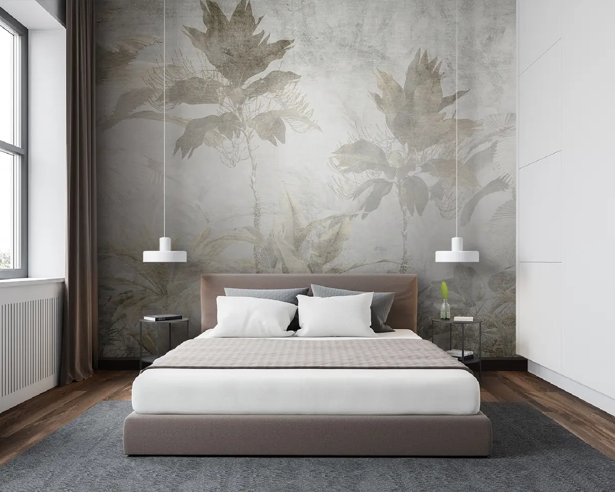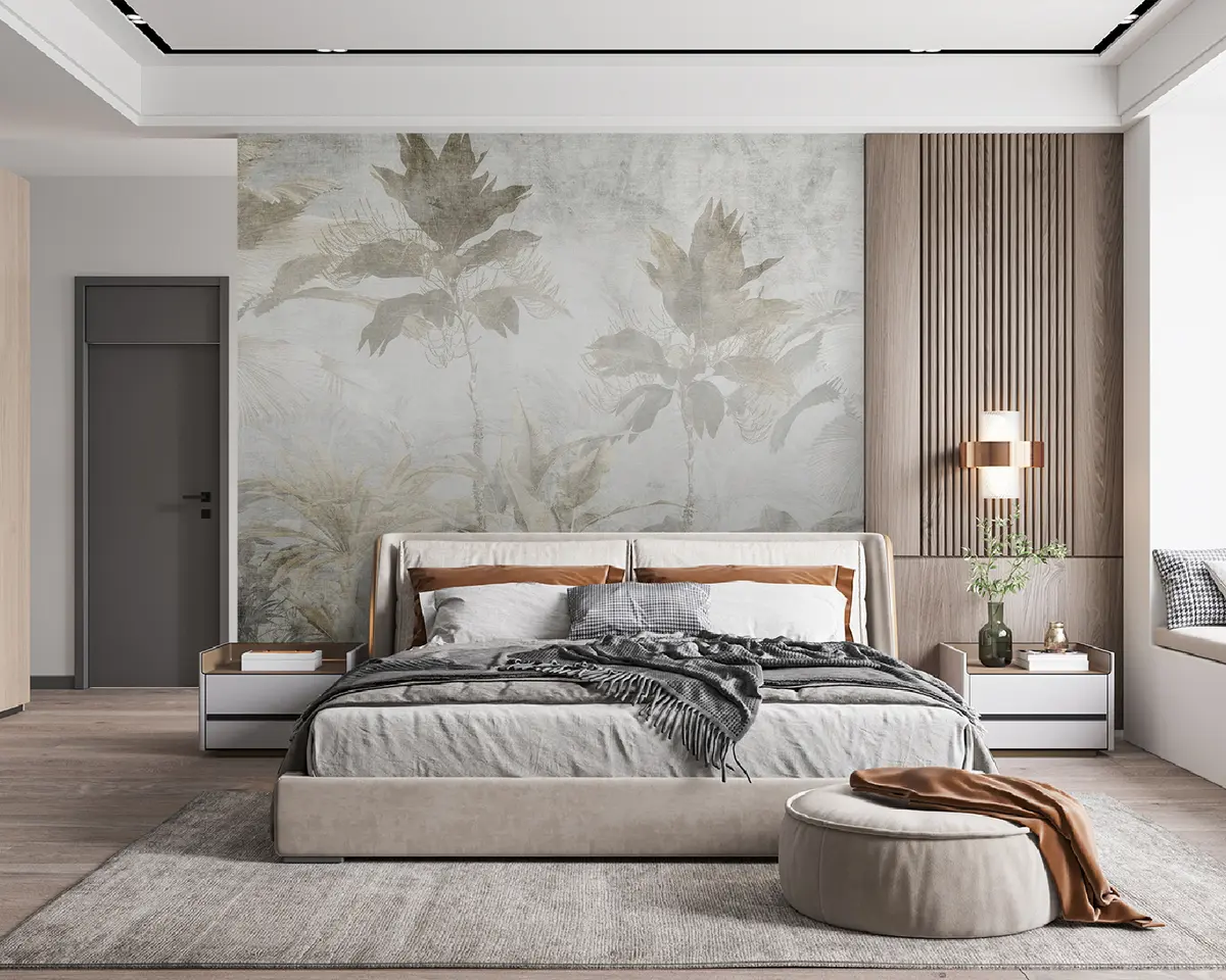 The addition of the brown botanical wall mural instantly transforms the living room into a serene sanctuary. The vintage nature theme pairs beautifully with the beige tones, creating a warm and inviting atmosphere. The tropical trees evoke a sense of tranquility and relaxation, while the soft colors enhance the overall spaciousness of the room. This elegant backdrop encourages a connection with nature, making the space feel both stylish and comforting, perfect for unwinding or entertaining guests.