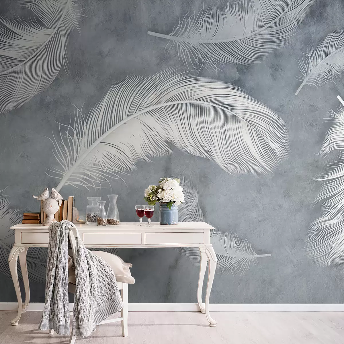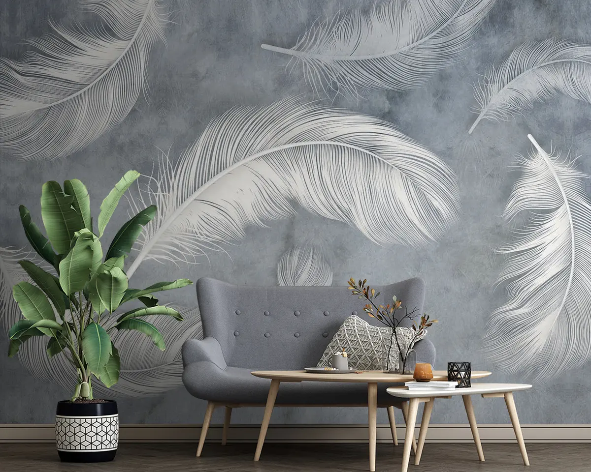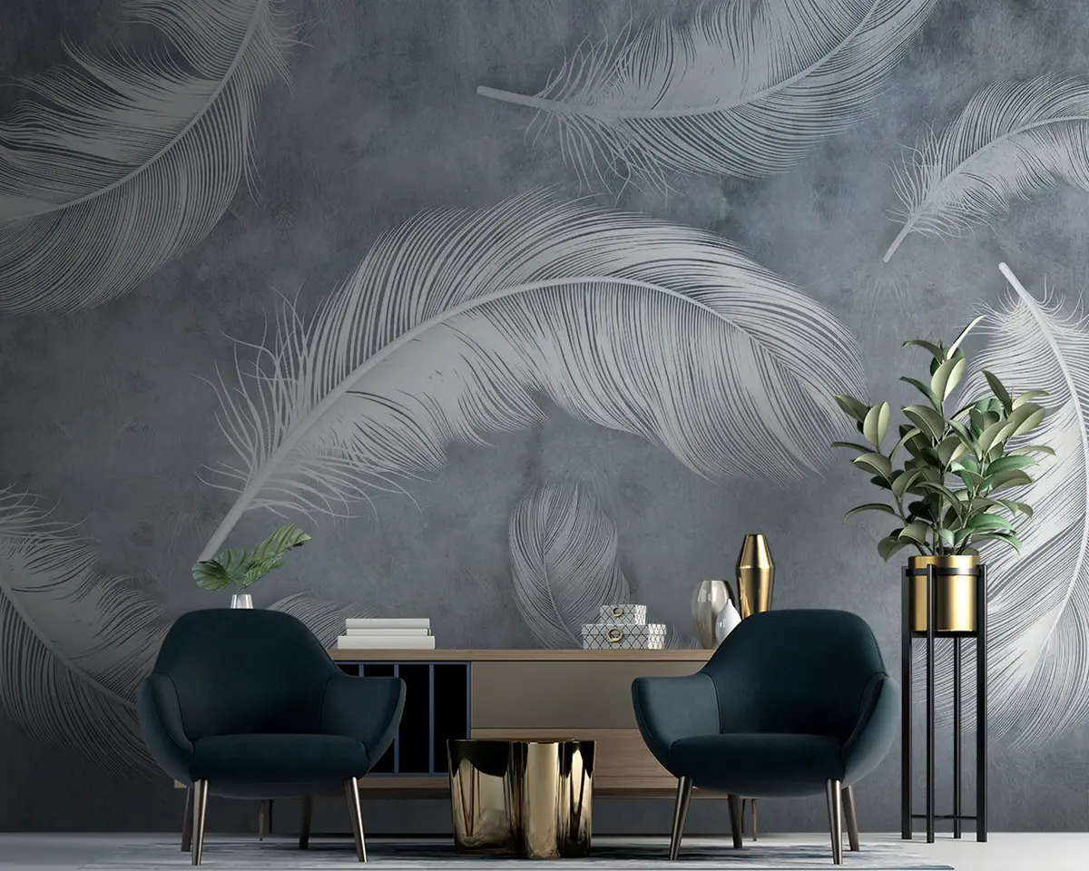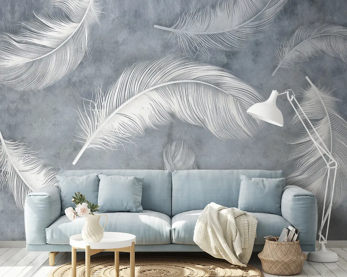 The addition of the Wall mural Organism, twig e feather Nr. u93395 transforms the living room into a serene sanctuary. The delicate white feathers against a calming blue background create a sense of lightness and tranquility. This artistic engraving draws the eye, enhancing the room's depth and texture. The overall ambiance feels more inviting and peaceful, making it an ideal space for relaxation or gatherings. The subtle elegance of the design complements various decor styles, uniting aesthetics and comfort beautifully.