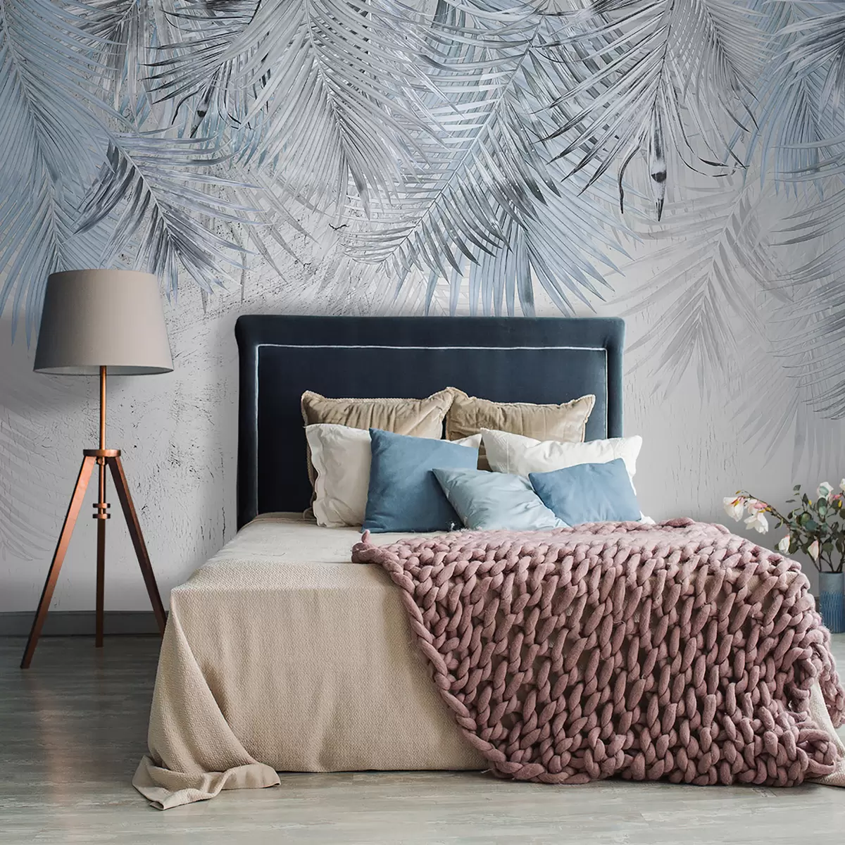The addition of the blue tropical leaves wall mural brings a refreshing and vibrant atmosphere to the living room. Its elegant grunge style harmonizes beautifully with contemporary decor, creating a serene backdrop. The soothing shades of blue enhance natural light, making the space feel larger and more inviting. The palm leaves add a touch of nature, promoting a sense of relaxation and tranquility. Overall, this mural transforms the room into a stylish oasis that embodies comfort and sophistication while encouraging a laid-back vibe.
