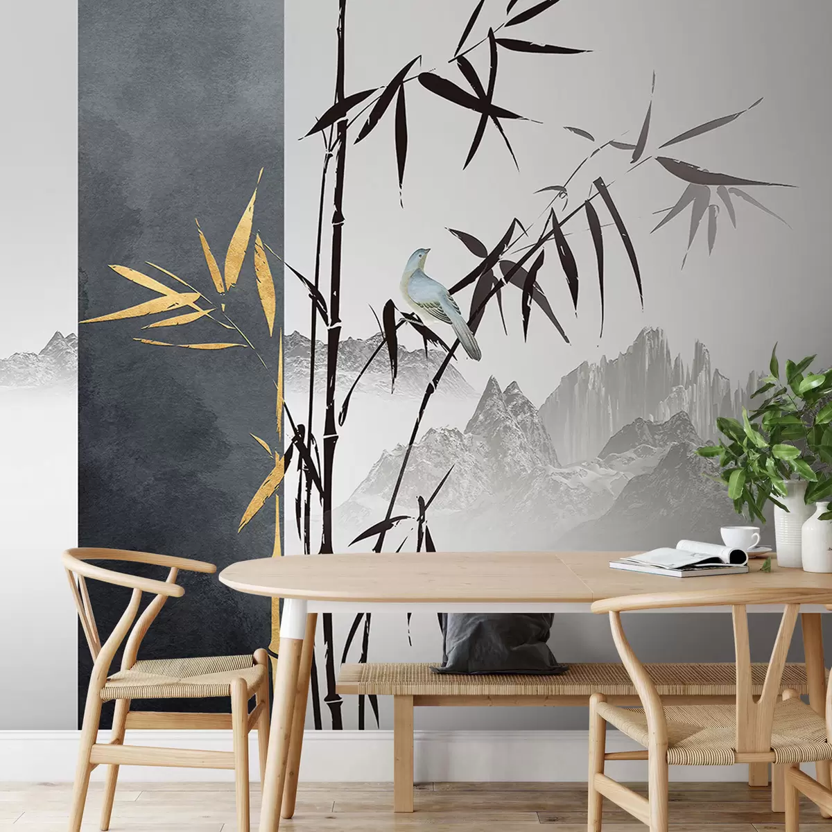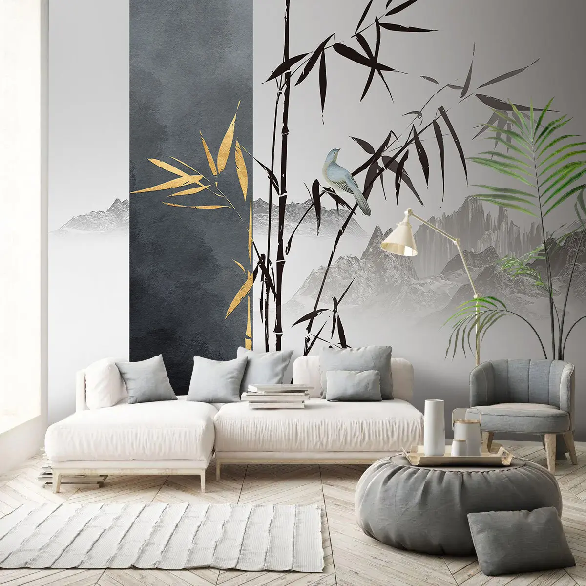 Transforming your living room with the Wall mural Bird on a branch Nr. u93849 creates an enchanting ambiance. The delicate depiction of birds and bamboo effortlessly blends traditional chinoiseries with a modern aesthetic. This mural serves as a stunning focal point, inviting a sense of tranquility and harmony. The soft hues and intricate details enhance the space, making it feel more spacious and inviting. The overall effect is a serene retreat that captures the essence of oriental elegance, perfect for relaxing or entertaining guests.