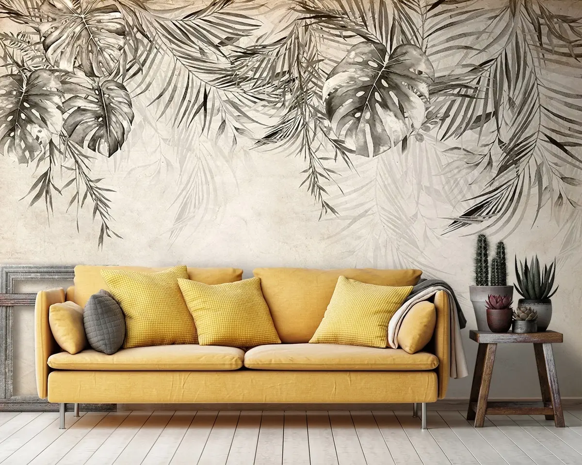 With the addition of the watercolor tropical leaves mural, the living room transforms into a serene retreat. The delicate depiction of palm leaves infuses the space with a sense of warmth and organic beauty. The vintage nature theme complements the existing decor, creating a harmonious atmosphere. This mural invites a refreshing, relaxed vibe, making the room feel more expansive and inviting. Natural tones and flowing designs seamlessly integrate with furniture, enhancing the overall aesthetic and providing an uplifting environment.