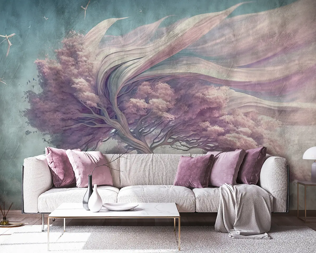 The installation of the wall mural featuring the ethereal tree against a stunning mountain backdrop transforms the living room into a serene oasis. The surreal depiction of nature invites a sense of tranquility, connecting the interior space with the beauty of the outdoors. Soft winds seem to flow through the room, enhancing the soothing ambiance. The tree, with its whimsical branches, adds a touch of whimsy, making the environment feel alive and vibrant. Overall, the mural revitalizes the space, creating an inspiring and peaceful retreat.
