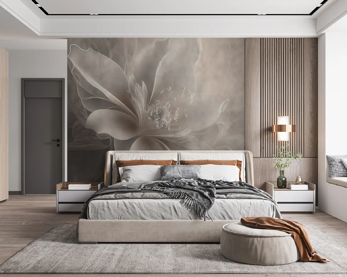 Transforming your living room with the delicate flower mural U93944 introduces an elegant touch that enhances the overall ambiance. The soft beige background and large flower motifs create a serene and inviting atmosphere. The intricate design draws the eye, making the space feel more spacious and airy. This mural serves as a stunning focal point, harmonizing beautifully with your decor and infusing the room with a sense of tranquility and sophistication, perfect for both relaxation and entertaining.