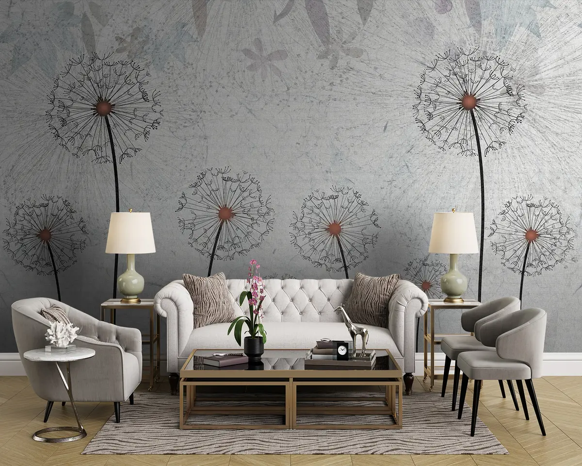 Incorporating the dandelion wall mural on a light gray background brings a refreshing touch to the living room, creating a serene and inviting atmosphere. The delicate dandelion designs add artistic flair, transforming the space into a calming retreat. This mixed media piece balances modern aesthetics with a natural feel, enhancing the overall decor. The soft tones harmonize beautifully with the light gray walls, allowing for easy coordination with furnishings and accessories, making the room feel cohesive and lively.