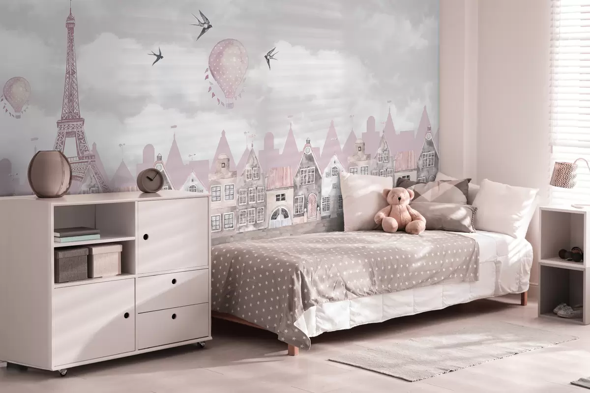 Transforming your living room with Wall Murals Fairytale Paris Nr. u94128 brings a whimsical charm that captivates visitors and creates a warm, inviting atmosphere. The soft pastel colors harmoniously blend, offering a serene backdrop for relaxation. The enchanting depiction of Parisian landmarks and hot air balloons ignites imagination, making it a perfect fit for a girls' room, newborn’s haven, or kids' space. This mural adds a delightful narrative element, inspiring creativity and wonder in the hearts of your loved ones.