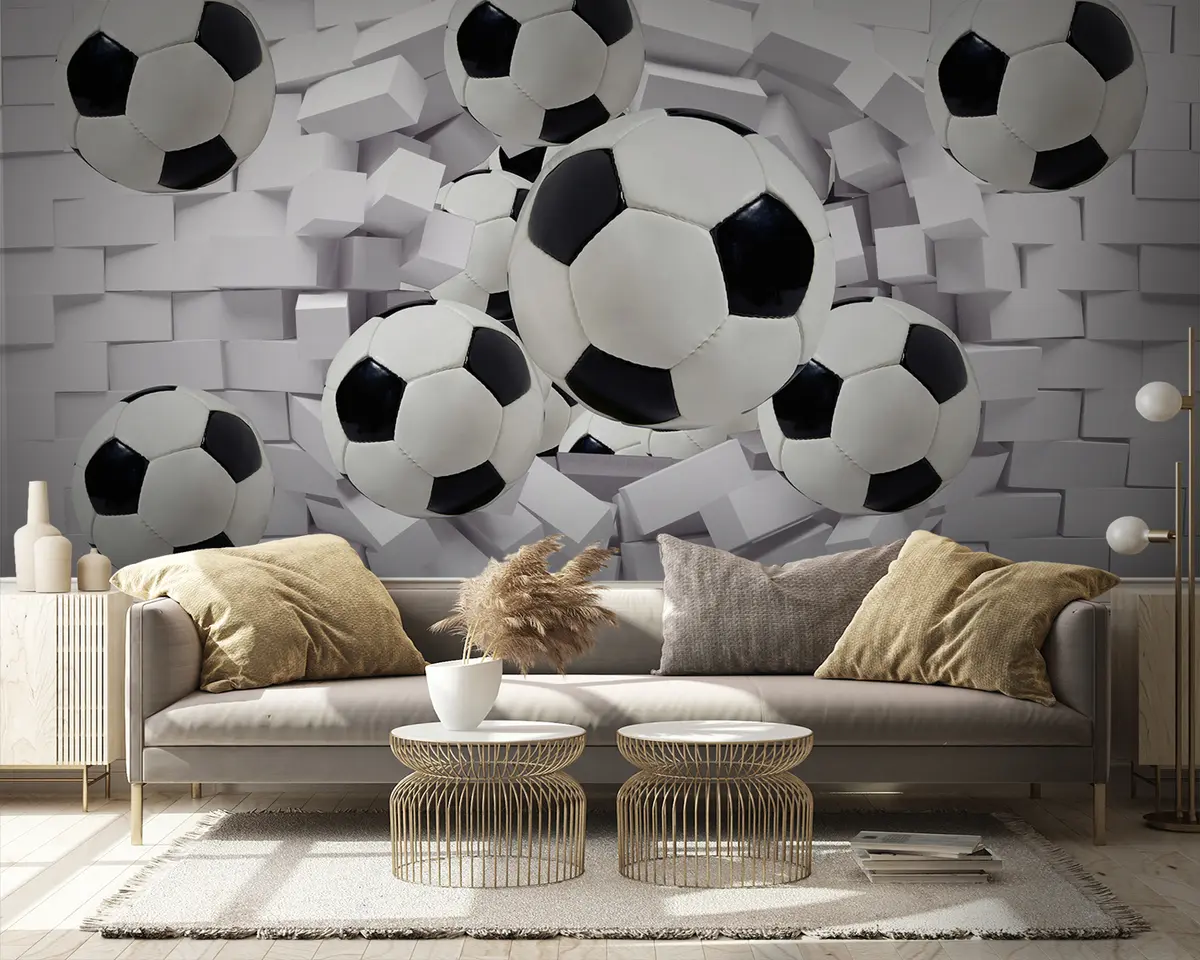 Transforming your living room with wall murals of soccer balls set against a brick background elevates the space into an energetic haven. The vibrant design imbues the room with a playful atmosphere, perfect for a boy's room. It adds depth, creating an illusion of motion that captivates the eye. The combination of the textured brick wall and dynamic soccer graphics invites an exciting and sporty vibe, inspiring creativity and joy. This innovative decor choice ensures a motivational environment for both relaxation and fun activities.