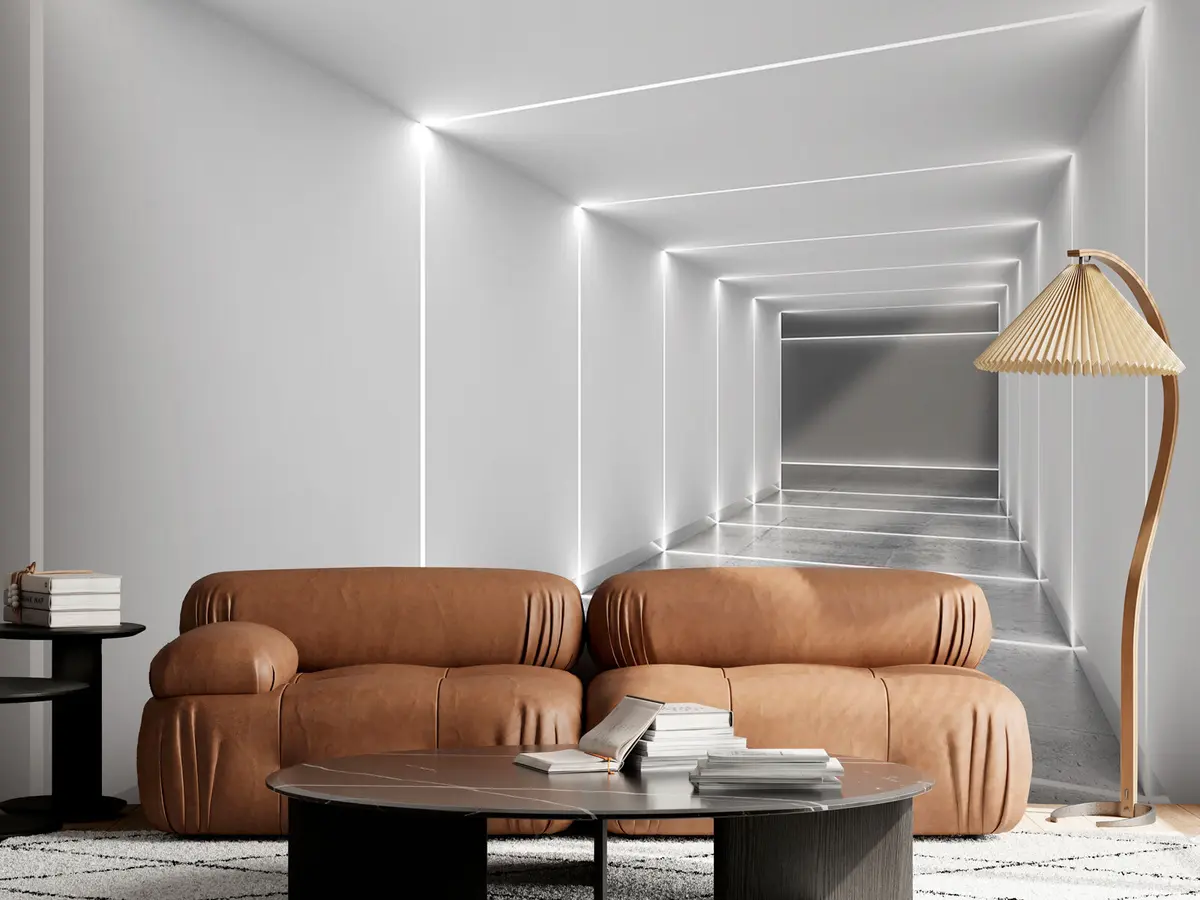 Transforming your living room with the Wall mural White tunnel creates an illusion of depth and spaciousness. The polished concrete floor beautifully complements the minimalist design, enhancing the overall aesthetic. This mural draws the eye, making the space feel modern and inviting. The clean lines and simplicity of the tunnel design contribute to a serene atmosphere, allowing for a peaceful retreat. The combination of these elements inspires a sense of openness and calm, perfect for relaxation or entertaining.