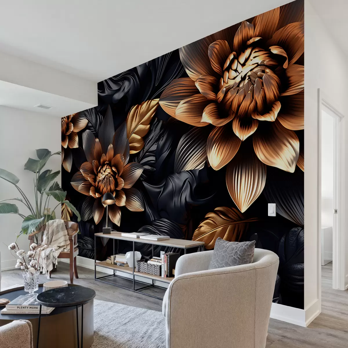 Transforming your living room with the Wall Murals Black Voluminous Flowers Nr. u95244 introduces a captivating elegance to the space. The 3D flowers create a striking focal point, drawing attention with their intricate detail and dramatic contrast. The dark backdrop enhances a sense of depth, while the bold floral designs infuse a touch of sophistication. This combination evokes a modern and chic atmosphere, making the room feel both inviting and luxurious, perfect for relaxation or entertaining guests.