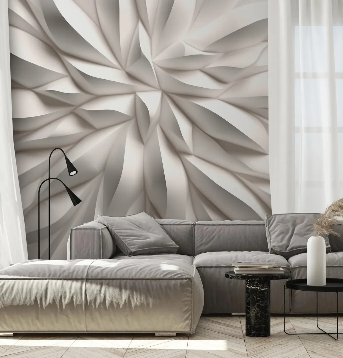 The addition of Wall Murals 3D Pattern Nr. u95250 transforms the living room into a sophisticated space that exudes modern elegance. The textured white design creates depth, making the room feel more spacious and inviting. Neutral light enhances the mural's texture, casting gentle shadows that shift throughout the day, adding a dynamic element. This feature not only elevates the overall aesthetic but also serves as a captivating focal point, encouraging conversation and admiration from guests. Overall, it enriches the ambiance with a harmonious blend of style and tranquility.