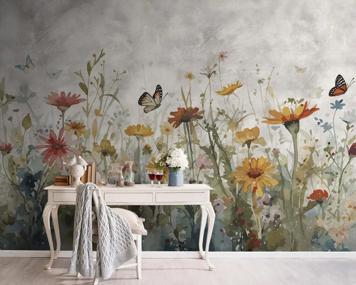 Transforming the living room with the wall mural of watercolor wildflowers and butterflies enhances the atmosphere, bringing a sense of tranquility and natural beauty indoors. The vibrant hues of the wildflowers create a lively focal point, inviting warmth and comfort. The fluttering butterflies add a whimsical touch, making the space feel more inviting and cheerful. This serene meadow scene encourages relaxation and brightens the room, fostering a connection to nature that enriches daily living.