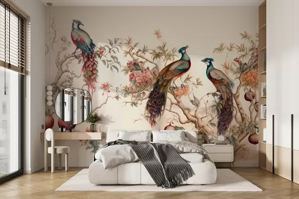 The addition of the wall mural featuring birds on branches of pomegranate has transformed the living room into a serene sanctuary. The intricate design brings a harmony of nature indoors, enhancing the space with vibrant colors and detailed depictions of peacocks nestled among lush foliage. This chinoiserie aesthetic offers an elegant touch, evoking a sense of tranquility and sophistication. The mural serves as a stunning focal point, infusing the room with character while fostering an inviting atmosphere for relaxation and conversation.