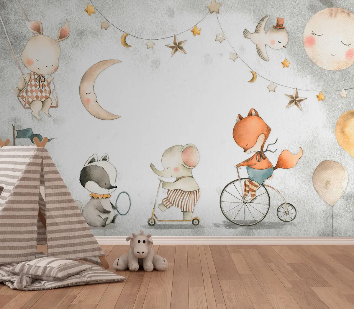 Transforming your living room with the wall mural featuring forest animals like an elephant, fox, badger, and rabbit infuses a sense of whimsy and warmth. The playful imagery creates a charming atmosphere that sparks imagination, making it a wonderful space for kids. This design fosters a serene, cozy vibe synonymous with hygge, encouraging family bonding and storytelling. The mural serves as a delightful focal point, enhancing the overall aesthetic of the room while inviting creativity and joy into daily life.