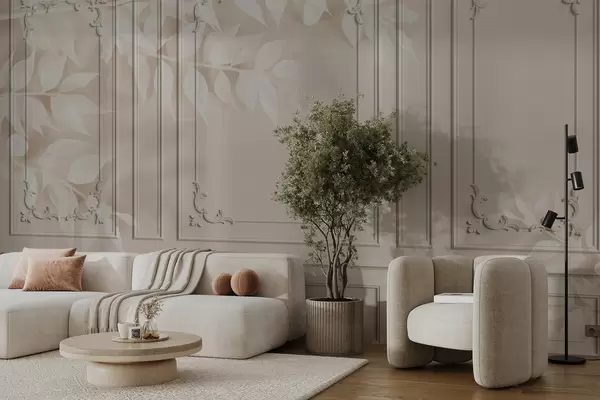 The addition of Wall murals Classic English Boiserie panels with leaves transforms the living room into an elegant sanctuary. The soft beige tones create a warm and inviting atmosphere, enhancing the neoclassical aesthetic of the space. The delicate leaf motifs bring a touch of nature indoors, fostering tranquility. The intricate detailing of the panels adds depth and sophistication to the walls, making the room feel more spacious and refined. Overall, these elements harmoniously elevate the interior, blending classical charm with modern comfort.