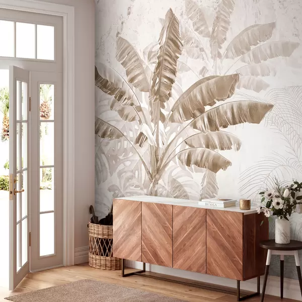 The addition of the tropical banana trees mural transforms the living room into a serene oasis, inviting a sense of nature indoors. The monocolor design enhances the space with soft tones, creating a calming backdrop that complements various decor styles. The palm leaves elegantly draw the eye, adding depth and a touch of exotic charm. This vintage nature theme fosters a relaxed atmosphere, encouraging a connection with the outdoors while providing a modern twist that refreshes the overall aesthetic of the room.