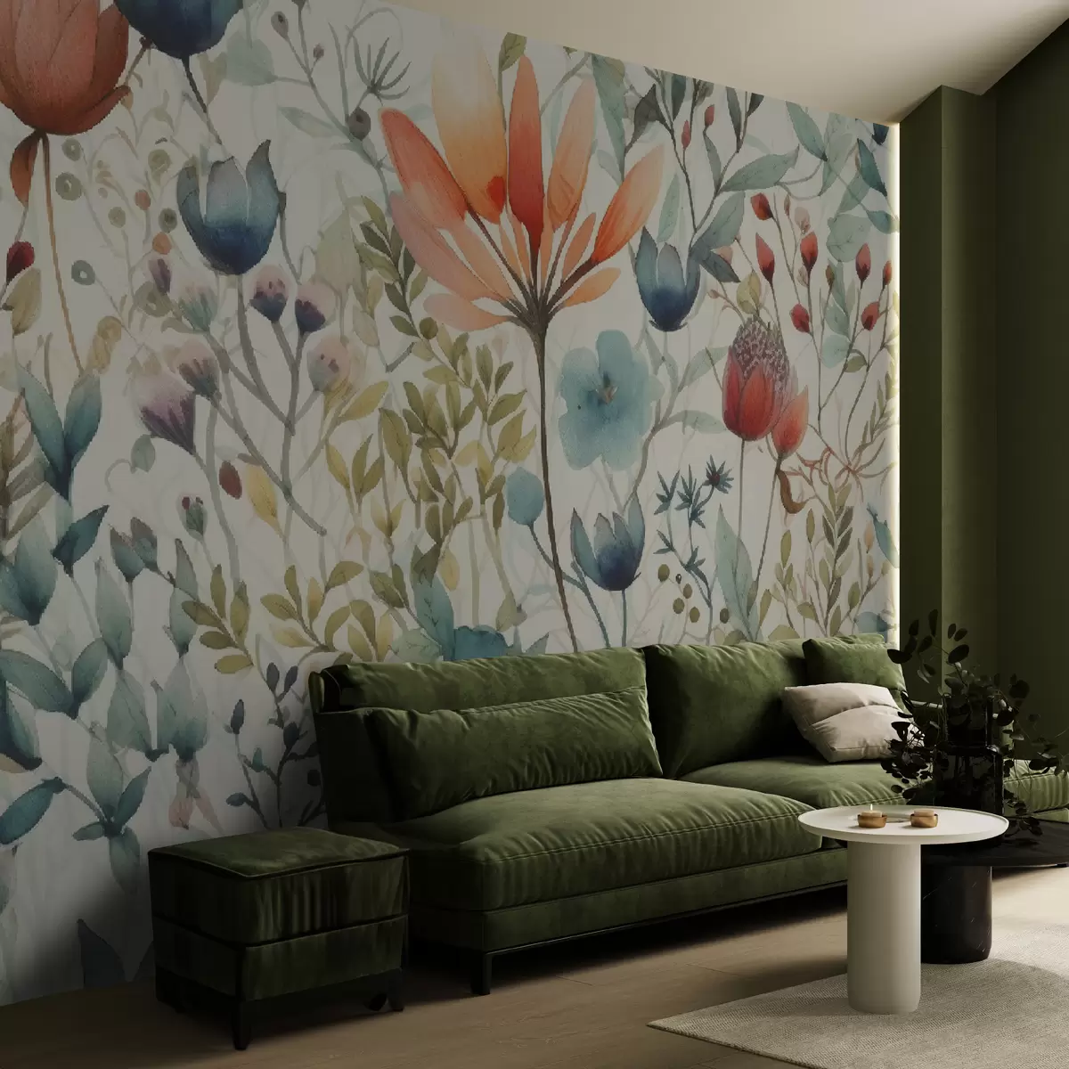 Transforming your living room with the Wall murals Flowers in pastel colors creates a serene and inviting atmosphere. The botanical art featuring delicate wild flowers breathes life into the space, encouraging relaxation and uplifting spirits. Soft hues blend harmoniously, making the room feel brighter and more open. The naturalistic design invites the beauty of the outdoors inside, fostering a sense of peace and tranquility. This vibrant yet subtle decor enhances your living area, creating a refreshing and dynamic environment where you can unwind.