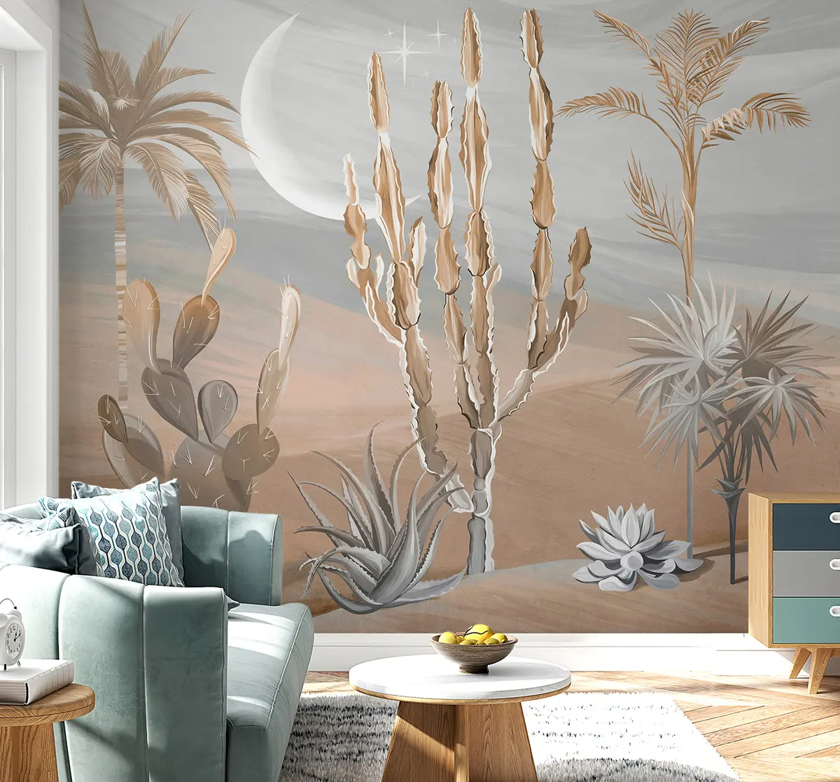 Transforming your living room with the 3D desert wall mural featuring cacti and tropical leaves introduces a vibrant and refreshing atmosphere. The botanical art enhances the natural light, making the space feel more open and inviting. Vintage nature elements create a sense of nostalgia, while the palm trees contribute to a tropical ambiance, seamlessly blending indoor comfort with an exotic flair. This captivating mural serves as a stunning focal point, inspiring relaxation and a connection to nature in your home.