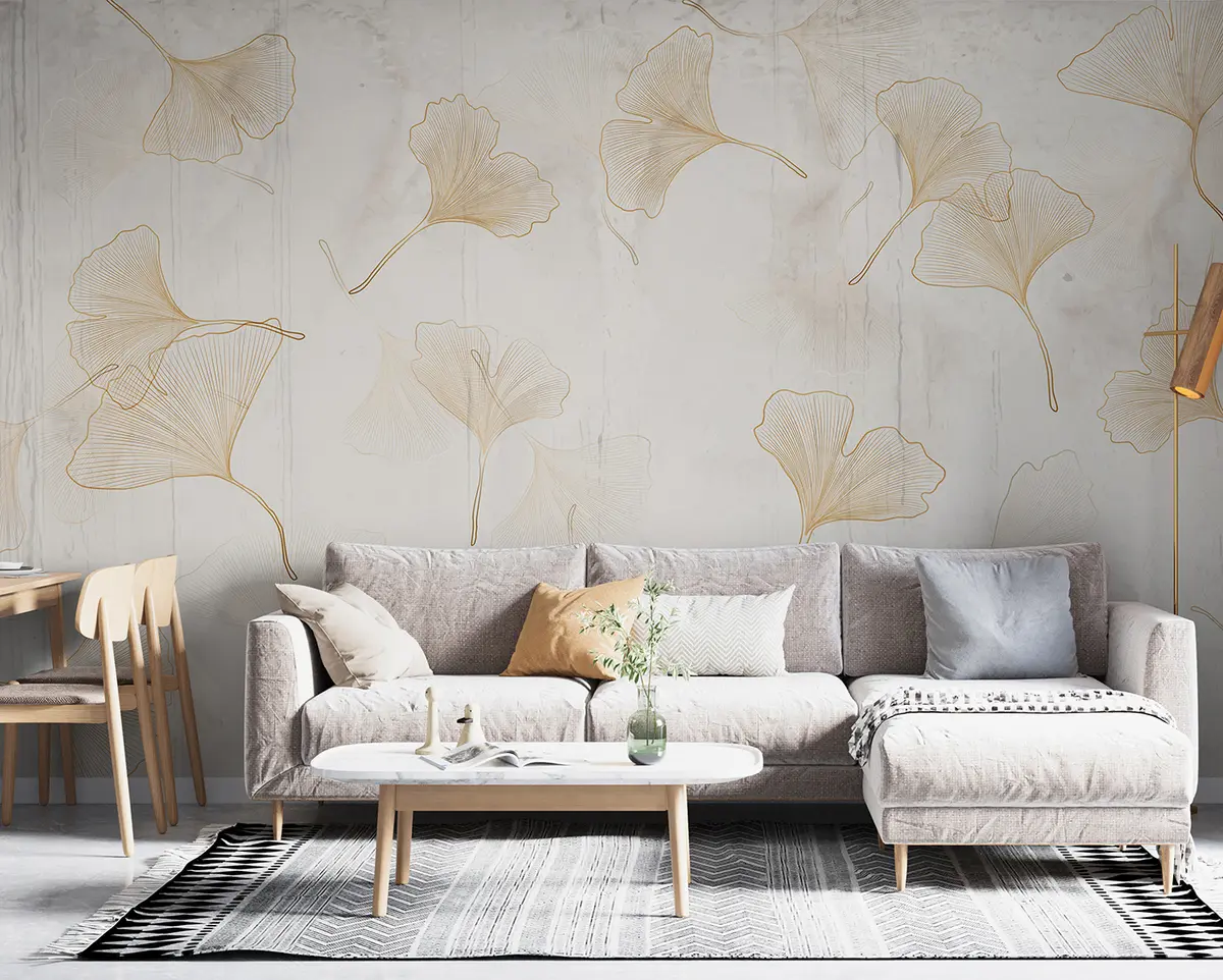 The addition of the beige-toned Ginkgo leaves wall mural brings a serene and elegant ambiance to the living room. The vintage nature design enhances the space by providing a calming yet sophisticated backdrop, seamlessly blending with the existing decor. The soft colors create a harmonious flow, making the room feel brighter and more inviting. This herbal motif not only adds visual interest but also evokes the beauty of nature, creating a tranquil environment perfect for relaxation and reflection.