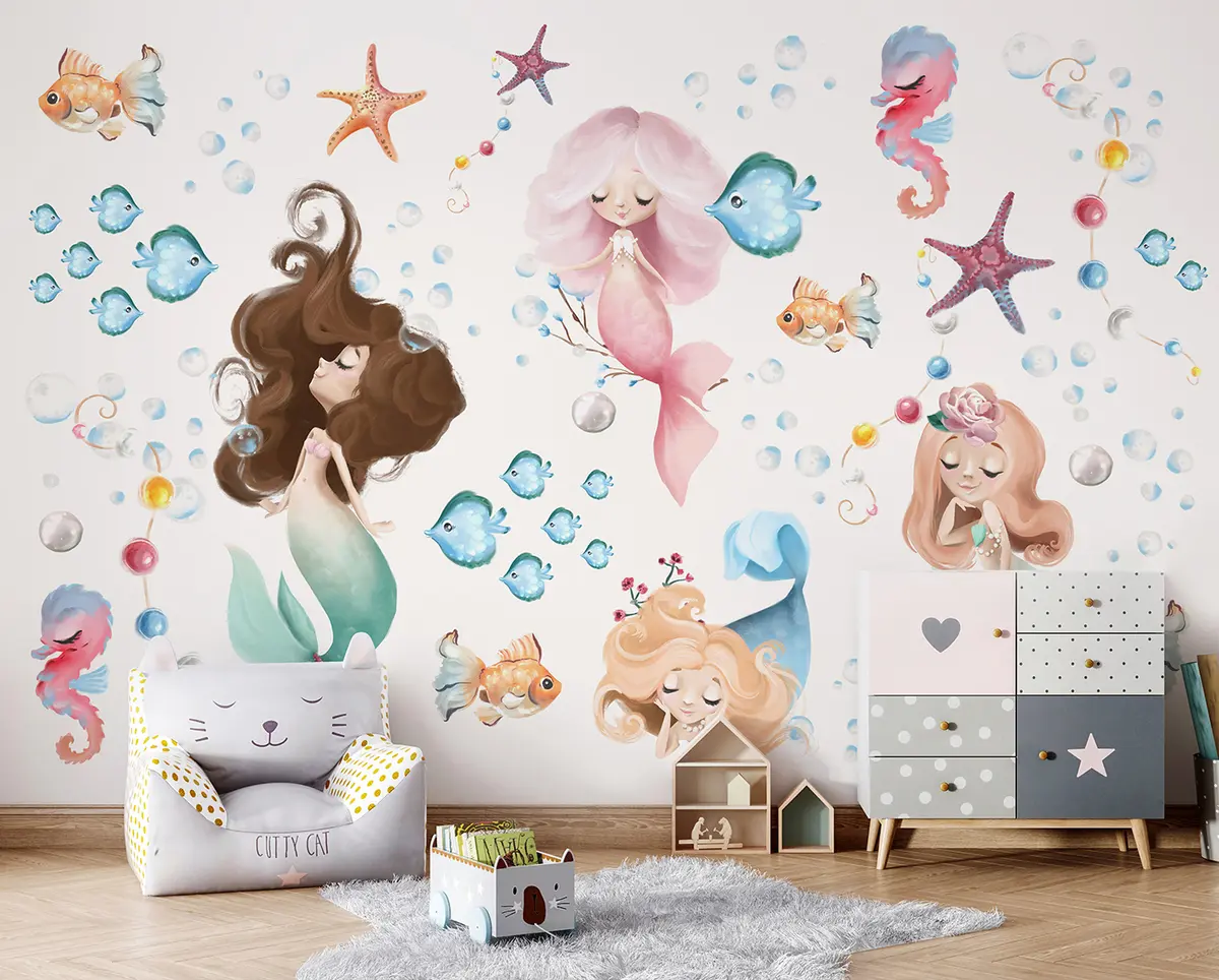 Transforming your living room with the Watercolor mermaids and fish mural creates an enchanting atmosphere, perfect for a girl's room or kid's space. The playful mermaids and vibrant aquatic life infuse energy and creativity into the room. Soft colors harmonize beautifully with existing decor, making the space feel inviting and cheerful. This whimsical design sparks imagination, providing a unique backdrop for play and relaxation, while enhancing the overall aesthetic with its charming aquatic theme.