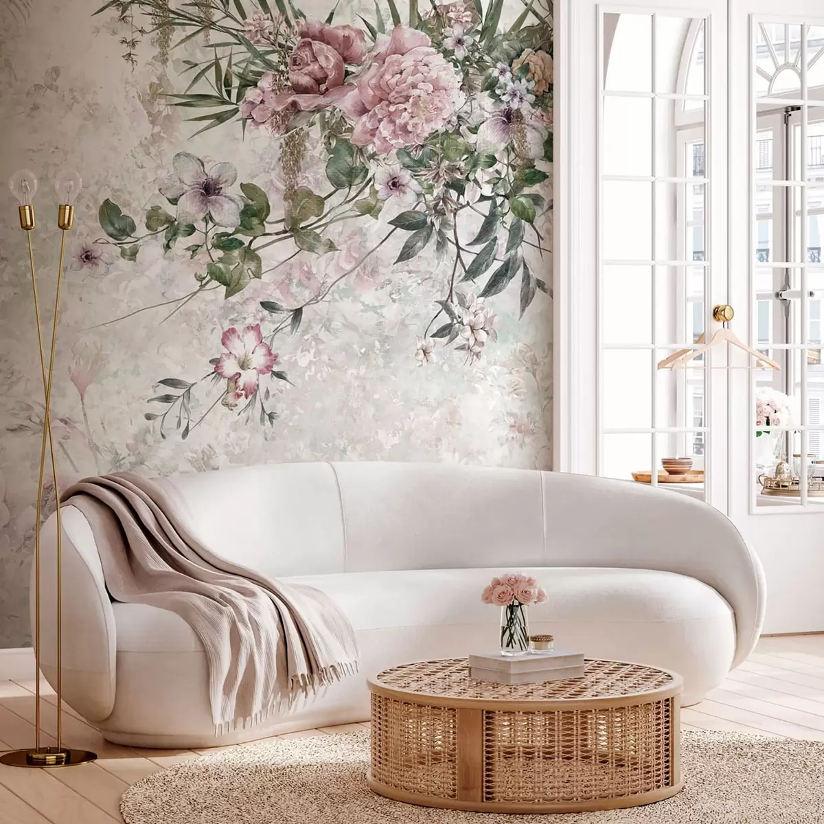 Transforming your living room with vintage flower wall murals on a marble wall brings a serene and inviting ambiance. The delicate floral patterns harmonize beautifully with the marble, creating an atmosphere that feels both elegant and warm. This vintage nature design infuses the space with a touch of romance, enhancing the natural light and providing a refreshing backdrop. The overall effect is both calming and uplifting, making the living room a delightful retreat, perfect for relaxation or entertaining guests.