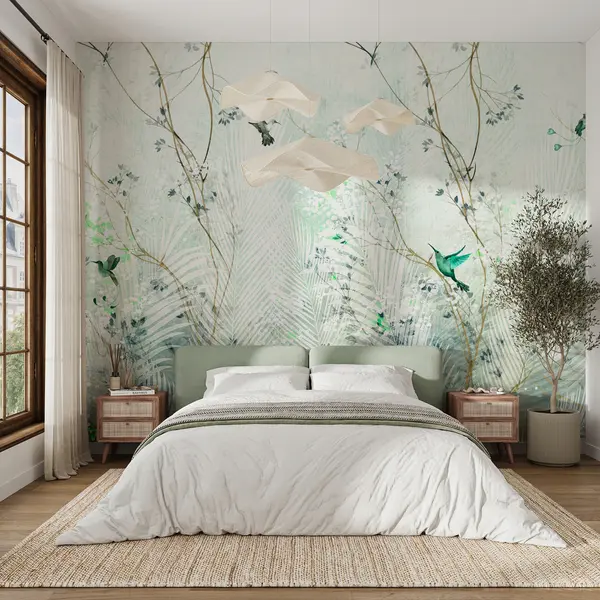 Transforming your living room with the Hummingbirds wall mural introduces a vibrant connection to nature. The delicate interplay of flora and fauna creates an inviting atmosphere, rich with vintage charm. Gentle hues and graceful forms breathe life into the space, making it feel more open and airy. The chinoiserie elements add an exotic flair, seamlessly merging elegance with a touch of whimsy. This mural inspires relaxation and conversation, turning your living area into a serene escape filled with the beauty of the natural world.