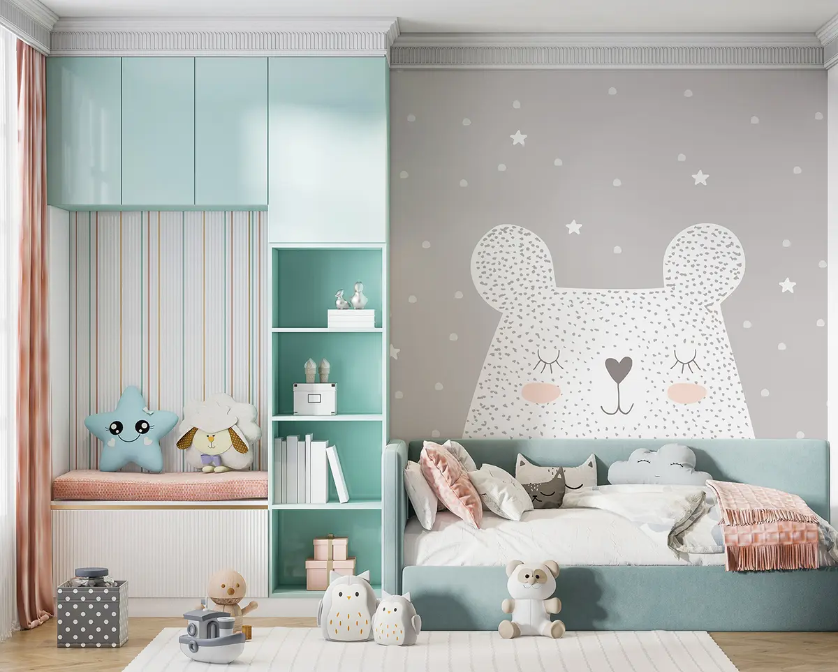 Transforming your living room with the Wall mural Bear Nr. u97174 creates a warm and inviting atmosphere. The playful bear design adds a whimsical touch, making the space feel cozy and child-friendly. It sparks joy and imagination, perfect for creating cherished moments with kids. The gentle color palette blends effortlessly with your decor while providing a calm backdrop that brightens the room. This mural encourages a sense of comfort and creativity, making your living area a delightful retreat for family and friends.