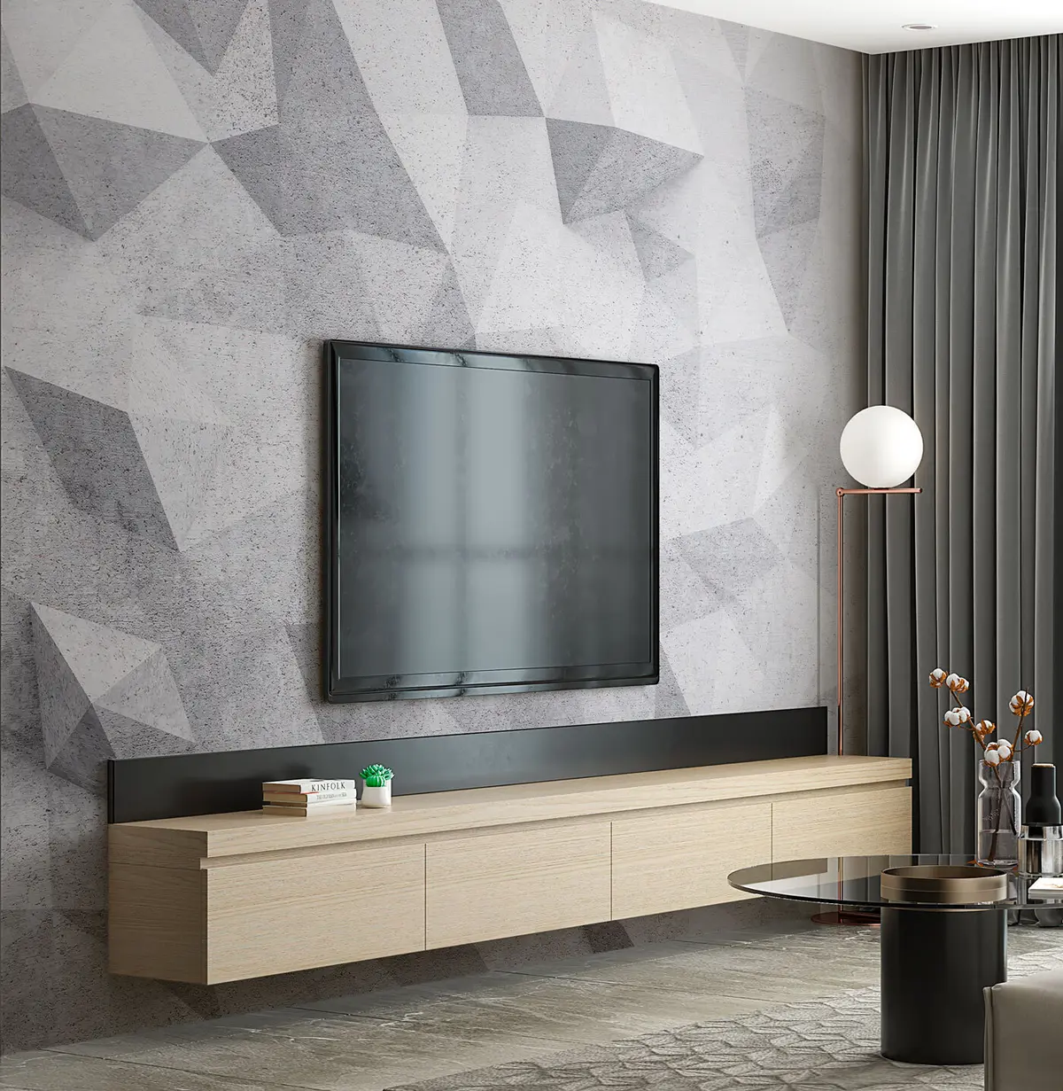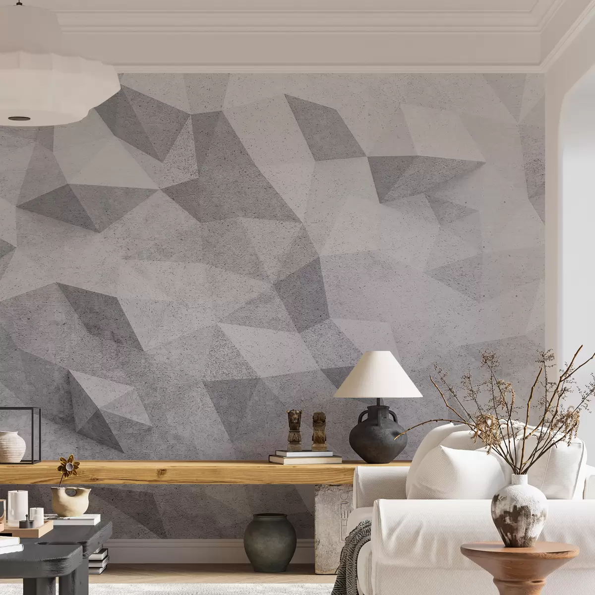 The addition of the Abstract 3D polygons grunge mural transforms the living room into a contemporary haven. The polygonal design creates visual depth, making the space feel larger and more dynamic. The triangles and concrete textures add an urban edge, seamlessly blending warmth and sophistication. This mural enhances the overall atmosphere, inspiring creativity and conversation among guests while establishing a unique focal point that captures attention without overwhelming the decor.