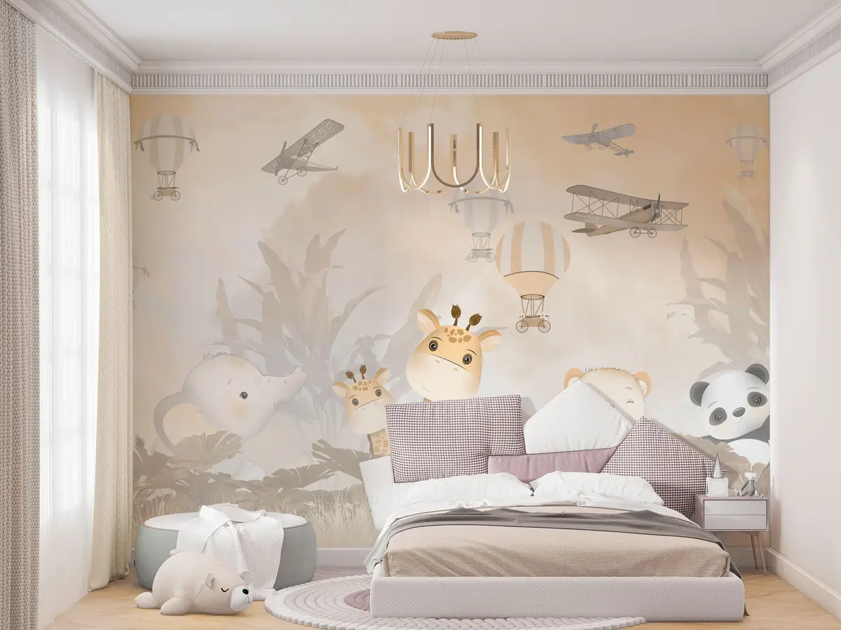 Transforming your living room with the Cute animal wallpaper creates a delightful atmosphere that exudes warmth and charm. The gentle beige tones and whimsical illustrations of playful animals and air balloons bring joy and imagination, making the space inviting for both kids and adults. The Enchanted forest theme adds a sense of adventure, encouraging creativity and exploration. This refreshing design not only enhances the room's visual appeal but also fosters a cheerful environment, perfect for family gatherings and playtime.