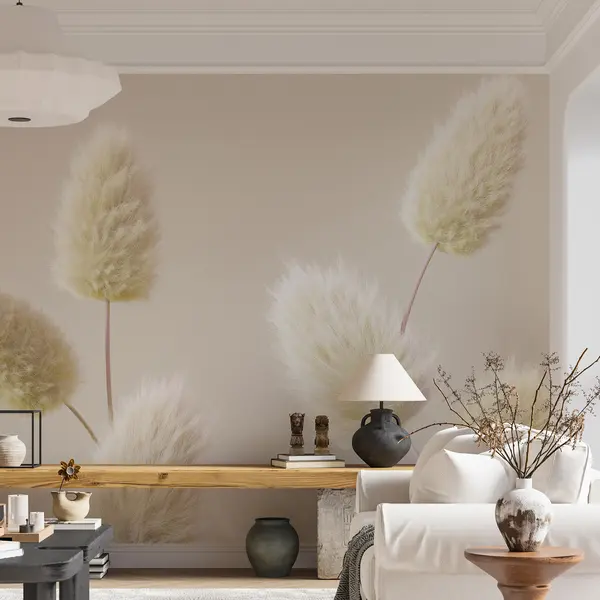 Transforming your living room with trendy beige dried flowers in boho style creates a serene and inviting atmosphere. The soft hues and organic shapes of the pampas grass evoke a sense of nature indoors, enhancing comfort and relaxation. The mural serves as a stunning focal point, harmonizing with existing decor and infusing the space with an earthy elegance. It effortlessly connects the outdoors with the cozy interior, making your living area feel more spacious and vibrant, perfect for gatherings or quiet moments of reflection.