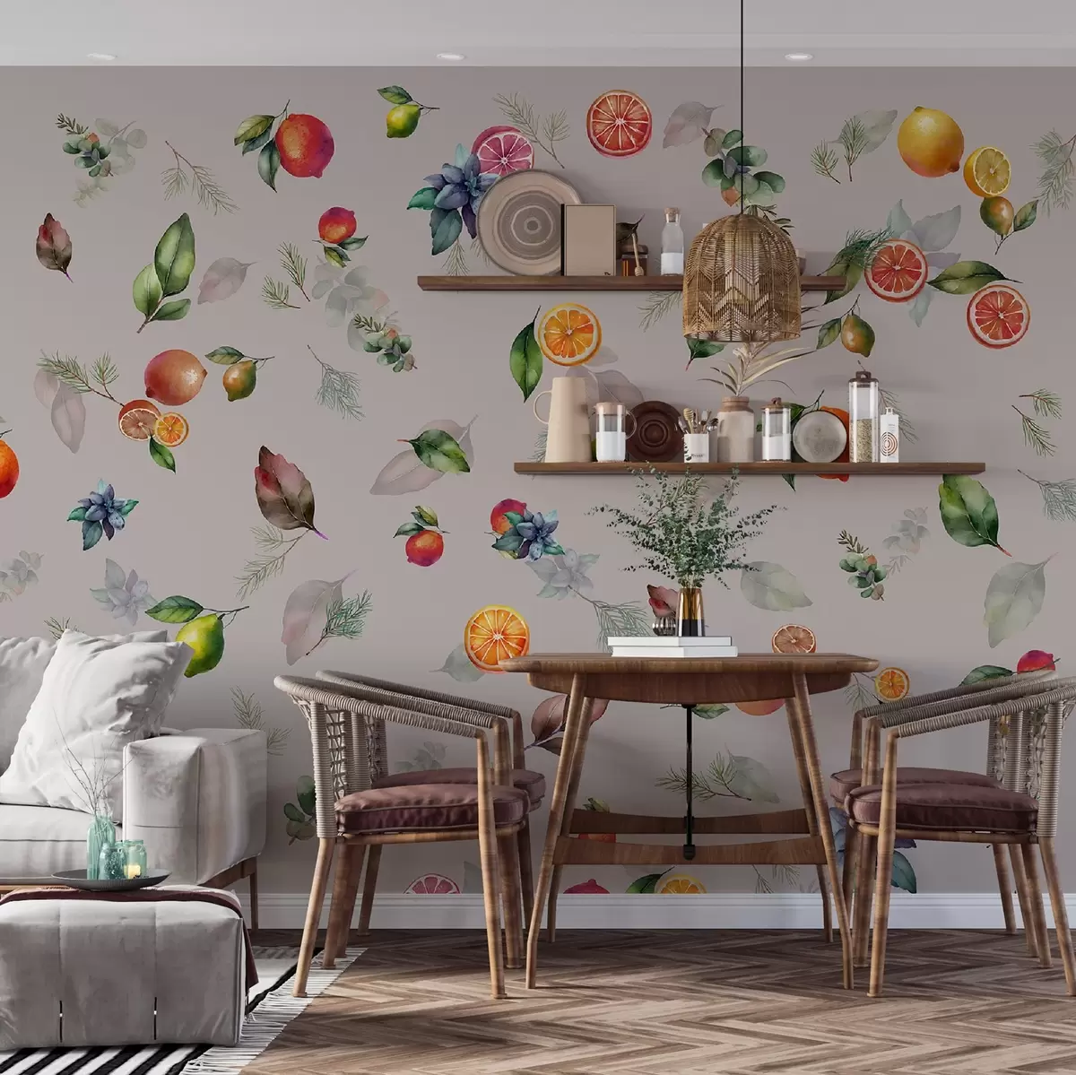 The addition of the colorful fruits and leaves mural transforms the living room into a vibrant and inviting space. The citrus fruit patterns, featuring lemons and oranges, infuse the room with a fresh, lively energy. Neutral light beautifully enhances the mural, making the colors pop while creating a warm ambiance. This mural serves as a captivating focal point, bringing nature indoors and evoking a cheerful atmosphere that uplifts the entire room. It harmonizes with the decor, making the space feel more refreshing and cheerful.