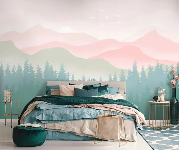 Transforming your living room with the Foggy Mountains wall mural brings a serene and inviting atmosphere. The soft natural colors of pink and green create a soothing backdrop that enhances a sense of calm. This panoramic design captures the essence of nature, allowing the space to feel more expansive and peaceful. The combination of misty mountains and a pine forest brings a touch of the outdoors inside, fostering a cozy, Hygge ambiance perfect for relaxation and reflection.