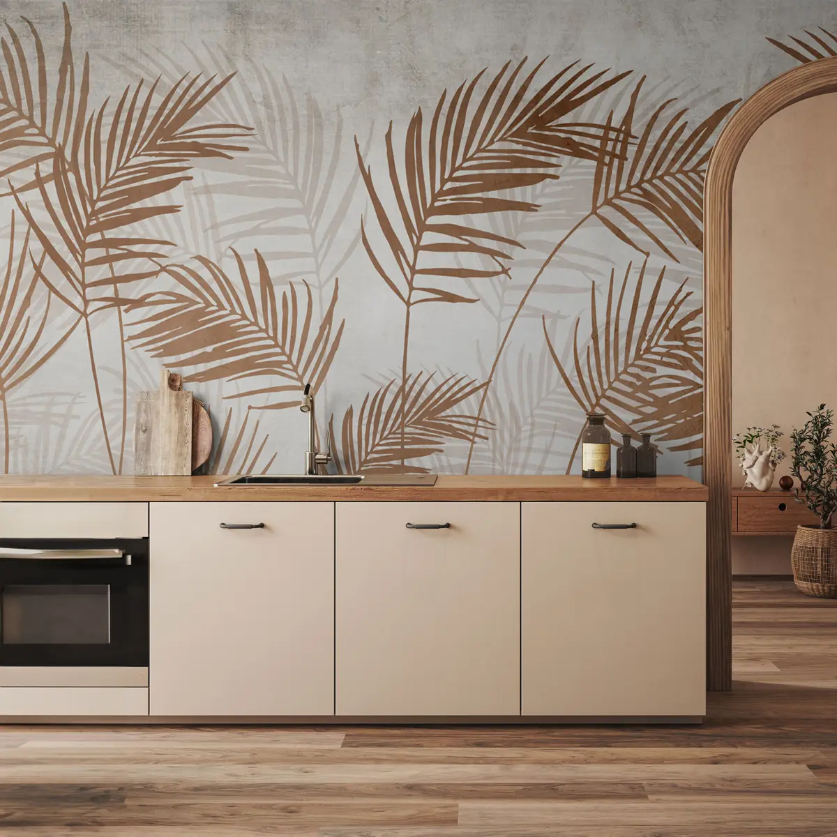 Transforming your living room with the tropical trees and leaves mural brings a refreshing and tranquil vibe. The soft ocher tones create a warm atmosphere, evoking the serene feel of a misty forest. The delicate palm leaves add depth and movement, drawing the eye and enhancing the sense of spaciousness. This wallpaper instills a sense of calm, making the space inviting and perfect for relaxation or social gatherings. Overall, the room feels more vibrant and rejuvenating, seamlessly connecting indoor living with nature.
