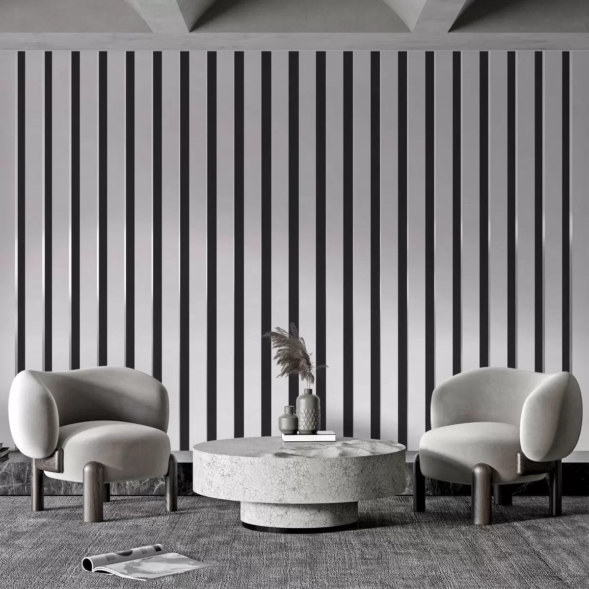 Transforming the living room with the wall mural in monochrome tones has brought a refreshing modernity to the space. The abstract pattern creates a striking focal point, enhancing the overall aesthetic. The dark stripes introduce depth and sophistication, making the room feel more dynamic and inviting. This combination of black tones adds a touch of elegance while allowing other decor elements to stand out, effortlessly connecting the room’s design. The atmosphere now feels more cohesive and stylish, perfect for both relaxation and entertaining.