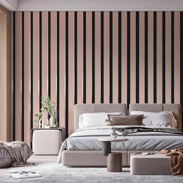 Adding the Wall murals Elegant lines in soft harmony Nr. u99471v2 has transformed the living room into a sophisticated space. The elegant beige tones gracefully harmonize with the striped design, creating a sense of volume and depth. The lines exude a calming rhythm, inviting relaxation and comfort. This stylish update enhances the overall ambiance, making the room feel more inviting and visually appealing, perfect for gatherings and quiet evenings alike. The mural serves as a stunning focal point, elevating the decor with simplicity and grace.