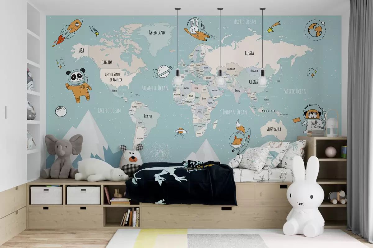 Transforming your living room with the Wall Murals Map of World Countries featuring animal astronauts brings a playful and vibrant atmosphere to the space. The colorful design energizes the room while sparking curiosity and imagination, making it perfect for children and adults alike. This unique mural not only serves as an educational tool but also as an engaging conversation piece. The cheerful elements uplift the overall design, creating a bright and welcoming environment that encourages exploration and creativity.