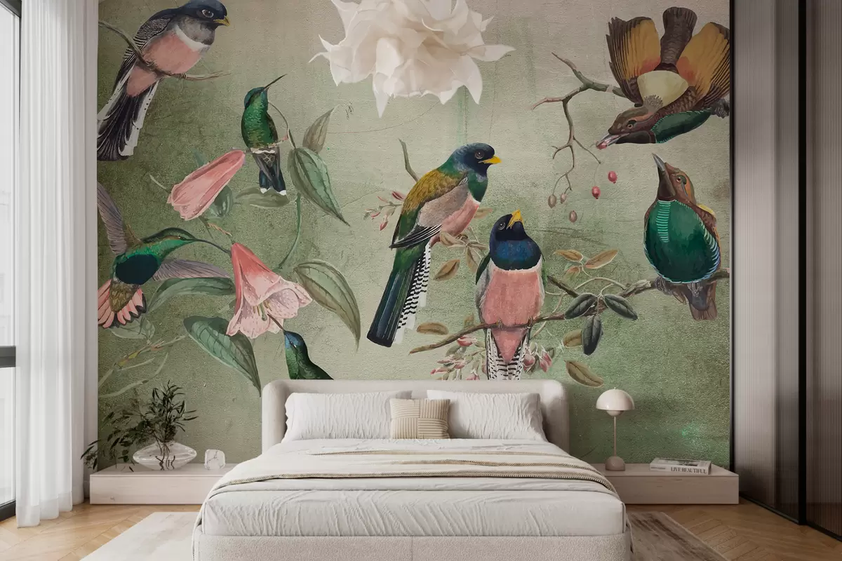 Transforming the living room with the wall mural of tropical birds perched on branches has brought a vibrant energy to the space. The delicate interplay of bright colors amid a textured backdrop creates a serene yet lively atmosphere. This mural serves as an engaging focal point, evoking a sense of nature and tranquility. The interplay of flora and fauna enhances the room's overall aesthetic, making it inviting and warm, perfect for relaxation or entertaining guests.