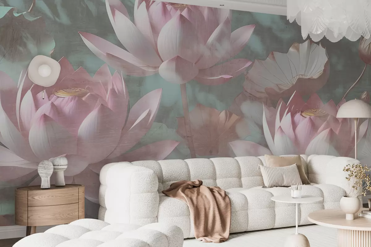 Transforming the living room with the wall mural featuring delicate pink lotus flowers brings a serene and calming ambiance. The pastel tones harmonize beautifully with the neutral light, creating an inviting atmosphere. The soft, blurred background enhances the overall tranquility, allowing for a peaceful retreat. The lotus flowers serve as a focal point, infusing the space with elegance and a touch of nature, making it a perfect setting for relaxation or social gatherings. This change elegantly elevates the room's aesthetic.